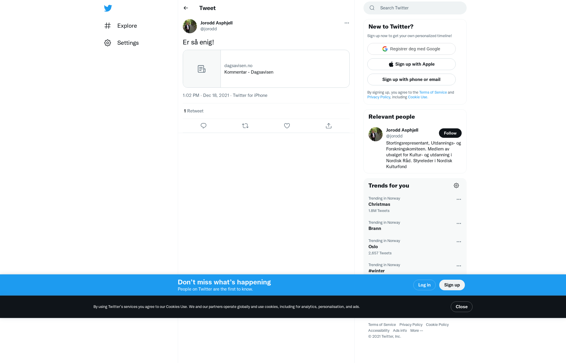 Dagsavisen bruker cookies (informasjonskapsler) til å vise deg relevante artikler, personalisere annonser og forbedre nettstedet. Ved å benytte nettstedet aksepterer du at vi kan sette cookies i din nettleser. Les mer om dette og hvordan du har kontroll over egne data i vår personvernerklæring