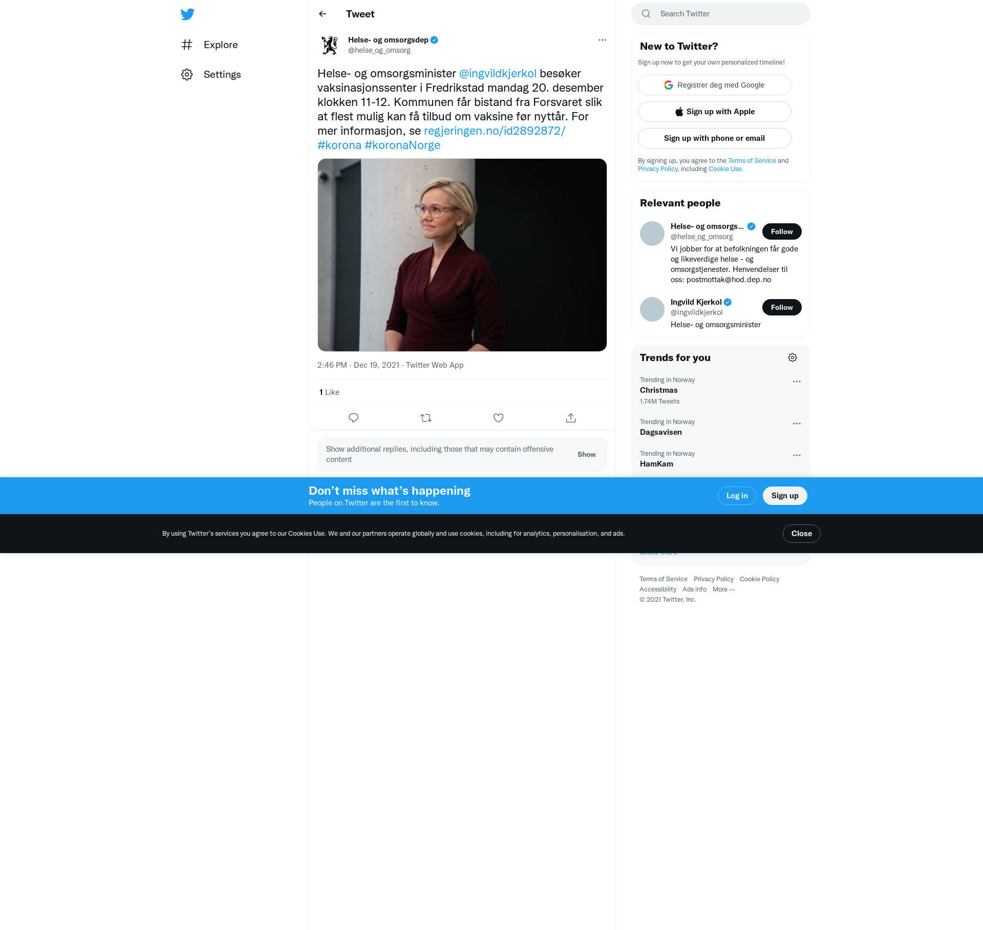 Helse- og omsorgsminister Ingvild Kjerkol besøker vaksinasjonssenter i Fredrikstad mandag 20. desember klokken 11-12. Kommunen får bistand fra Forsvaret slik at flest mulig kan få tilbud om vaksine før nyttår.