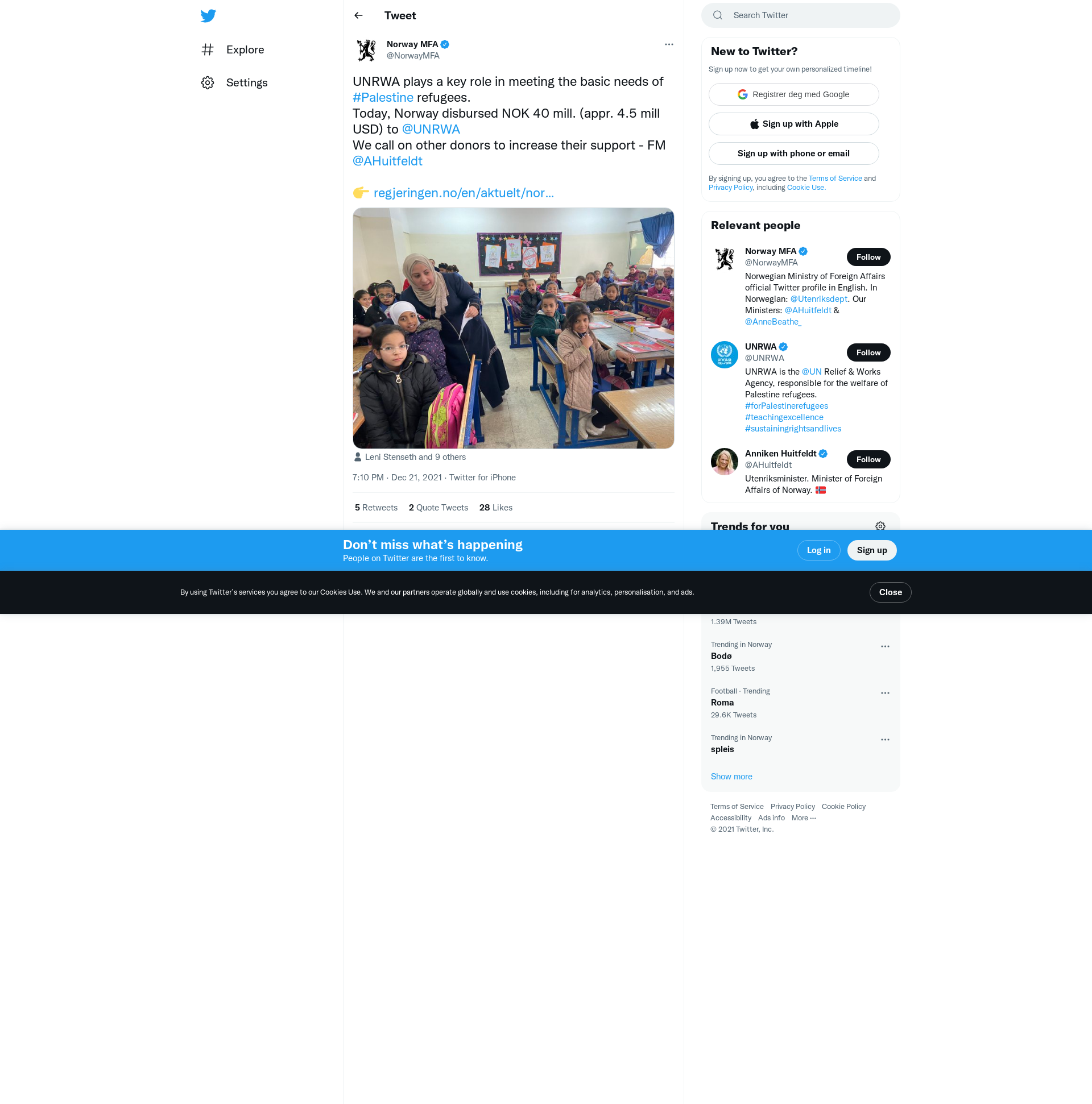 Today, Norway disbursed NOK 40 million to the UN Relief and Works Agency for Palestine Refugees in the Near East (UNRWA). This brings Norway’s total contribution to UNRWA for 2021 to NOK 257 million.