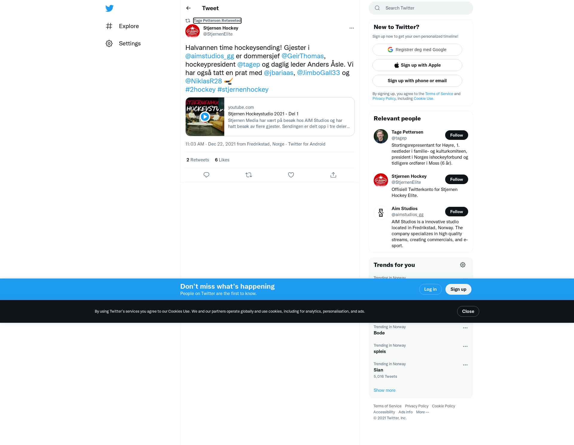 RT @StjernenElite: Halvannen time hockeysending! Gjester i @aimstudios_gg er dommersjef @GeirThomas, hockeypresident @tagep og daglig leder Anders Åsle. Vi har også tatt en prat med @jbariaas, @JimboGall33 og @NiklasR28 🏒