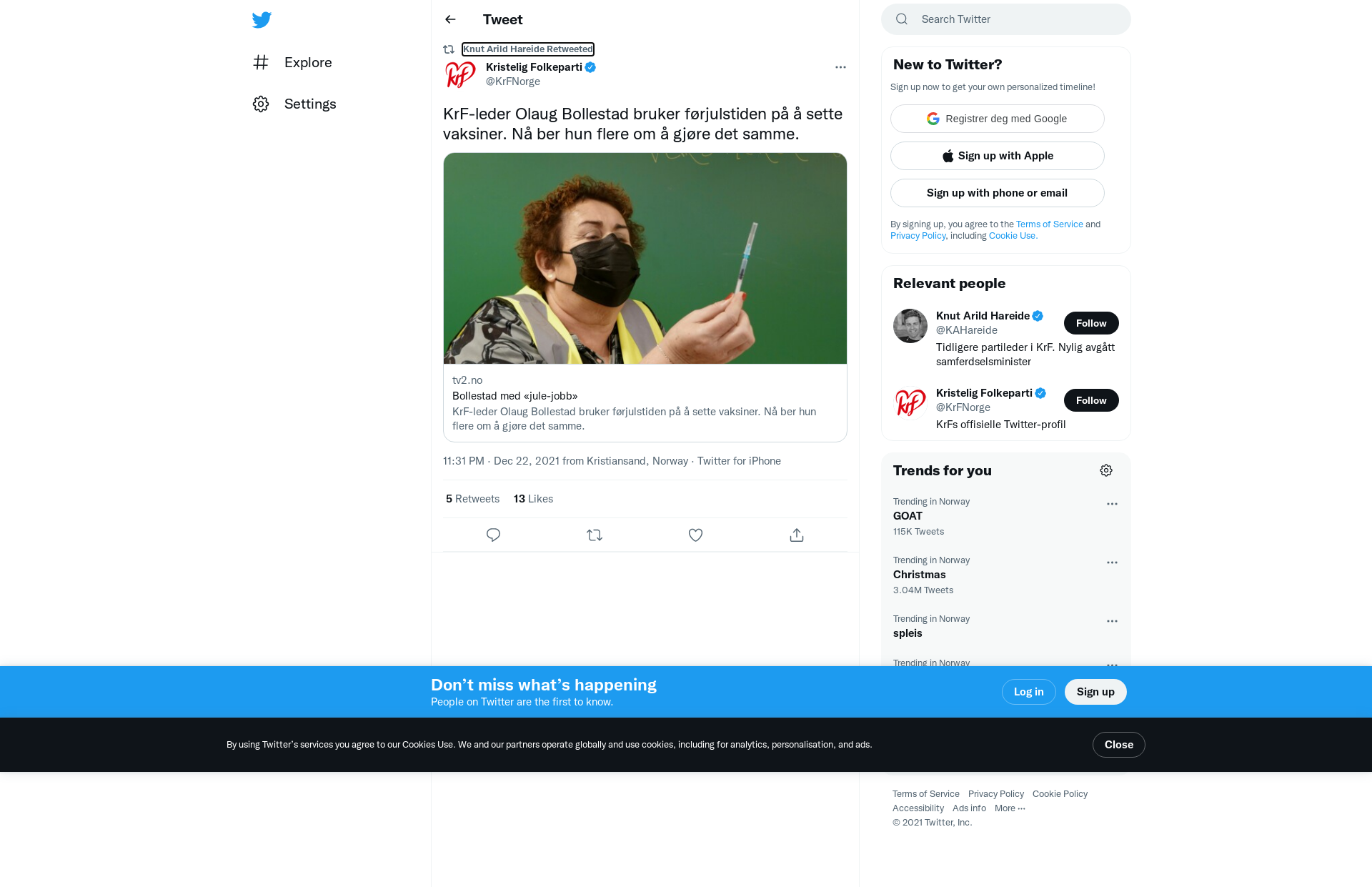 RT @KrFNorge: KrF-leder Olaug Bollestad bruker førjulstiden på å sette vaksiner. Nå ber hun flere om å gjøre det samme. https://t.co/NIIHKDHN93