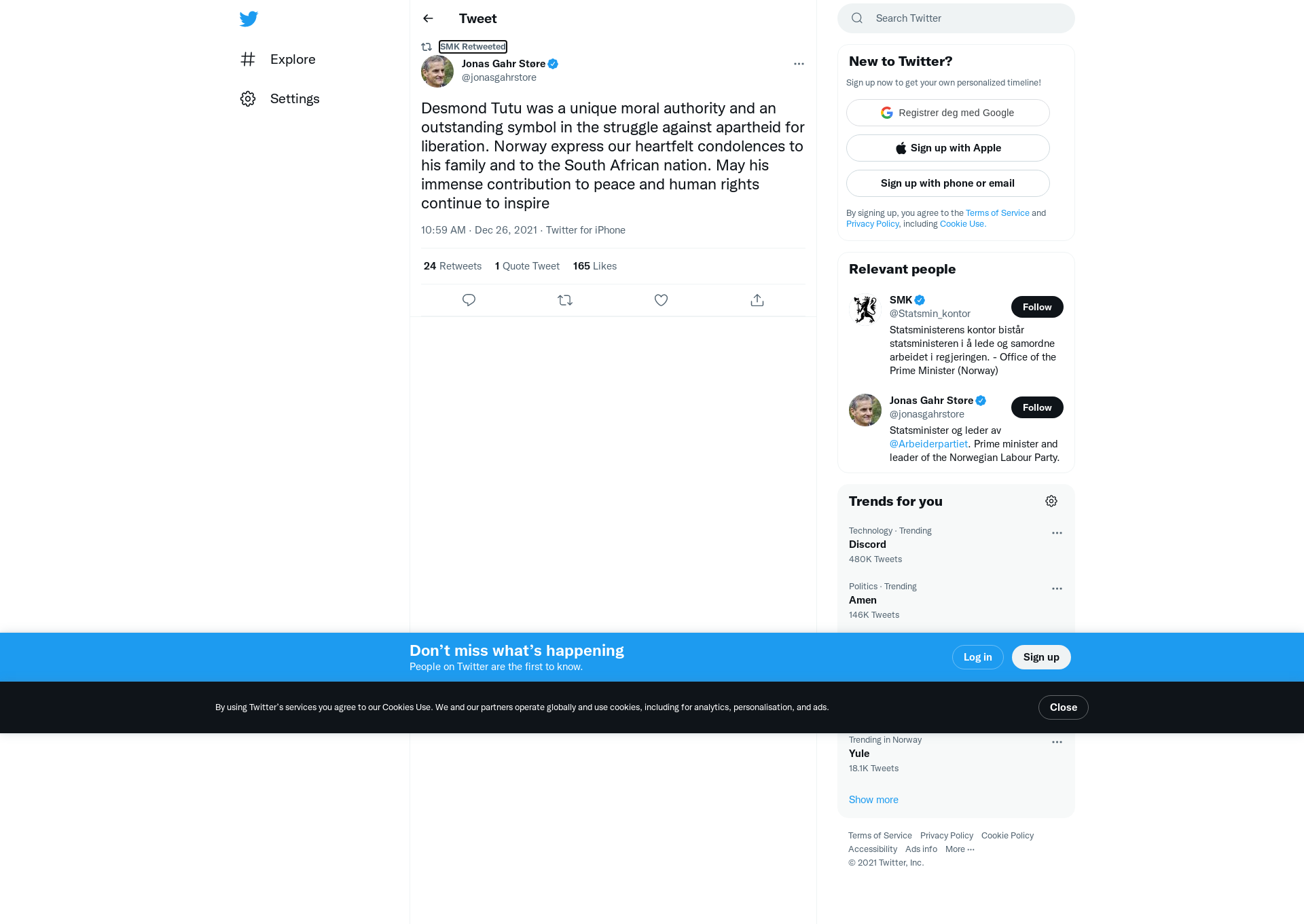 RT @jonasgahrstore: Desmond Tutu was a unique moral authority and an outstanding symbol in the struggle against apartheid for liberation. Norway express our heartfelt condolences to his family and to the South African nation. May his immense contribution to peace and human rights continue to inspire