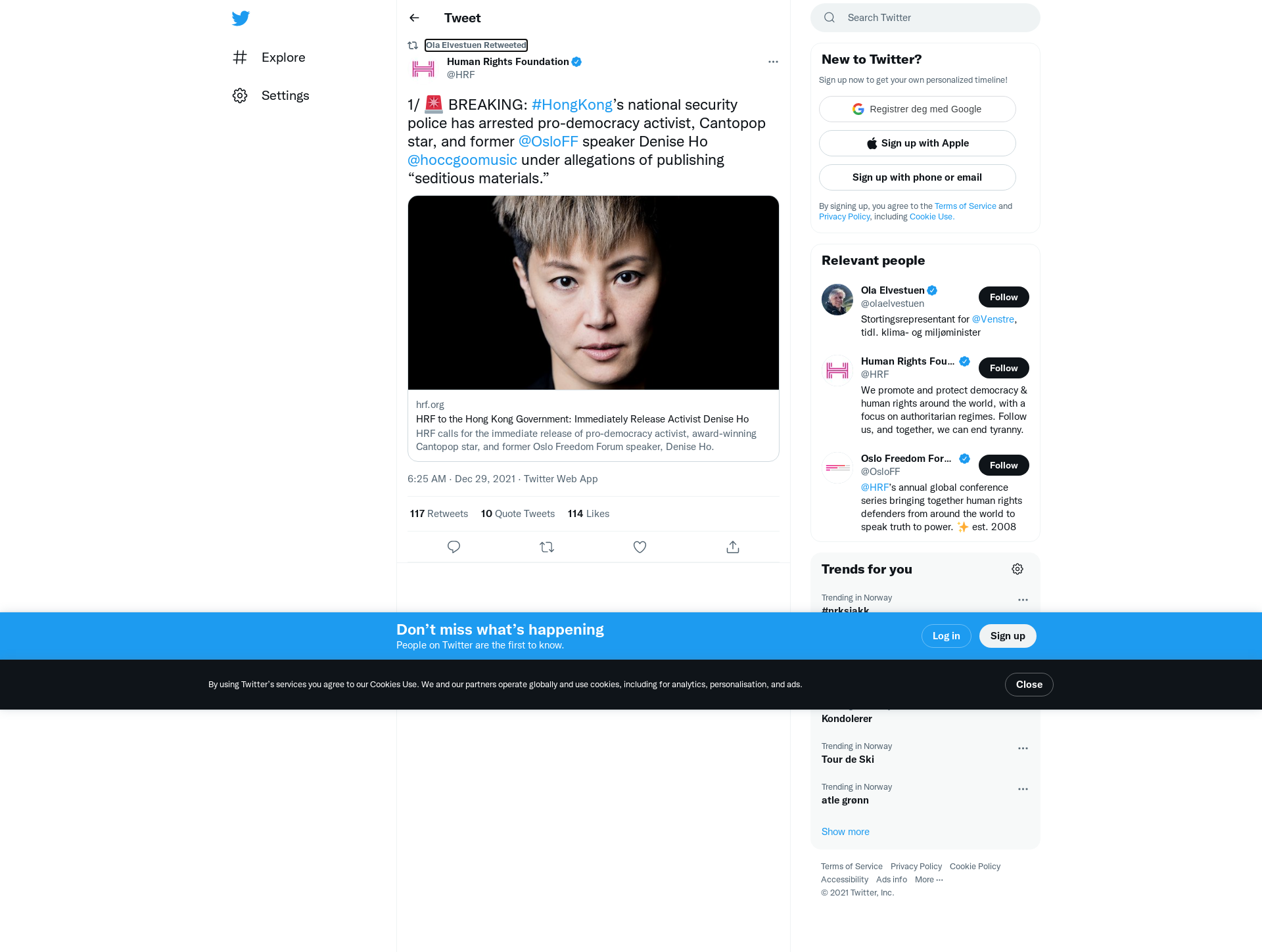 RT @HRF: 1/ 🚨 BREAKING: #HongKong’s national security police has arrested pro-democracy activist, Cantopop star, and former @OsloFF speaker Denise Ho @hoccgoomusic under allegations of publishing “seditious materials.”