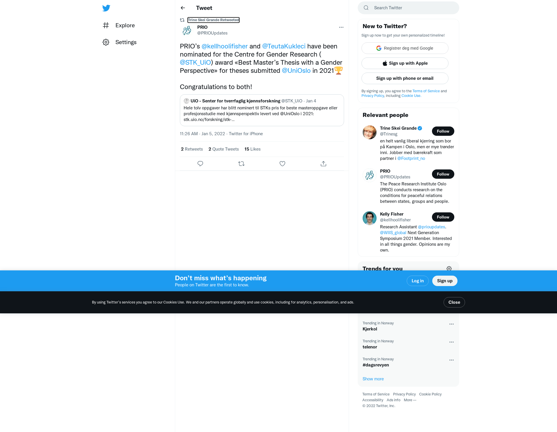 RT @PRIOUpdates: PRIO’s @kellhoolifisher and @TeutaKukleci have been nominated for the Centre for Gender Research (@STK_UiO) award «Best Master’s Thesis with a Gender Perspective» for theses submitted @UniOslo in 2021🏆