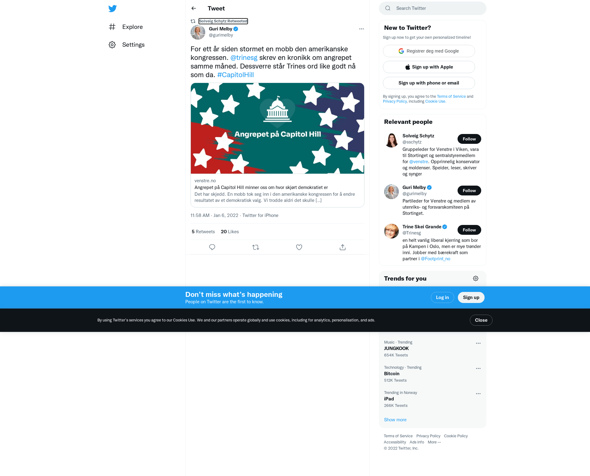 RT @gurimelby: For ett år siden stormet en mobb den amerikanske kongressen. @trinesg skrev en kronikk om angrepet samme måned. Dessverre står Trines ord like godt nå som da. #CapitolHill https://t.co/e3yGSFxcJZ