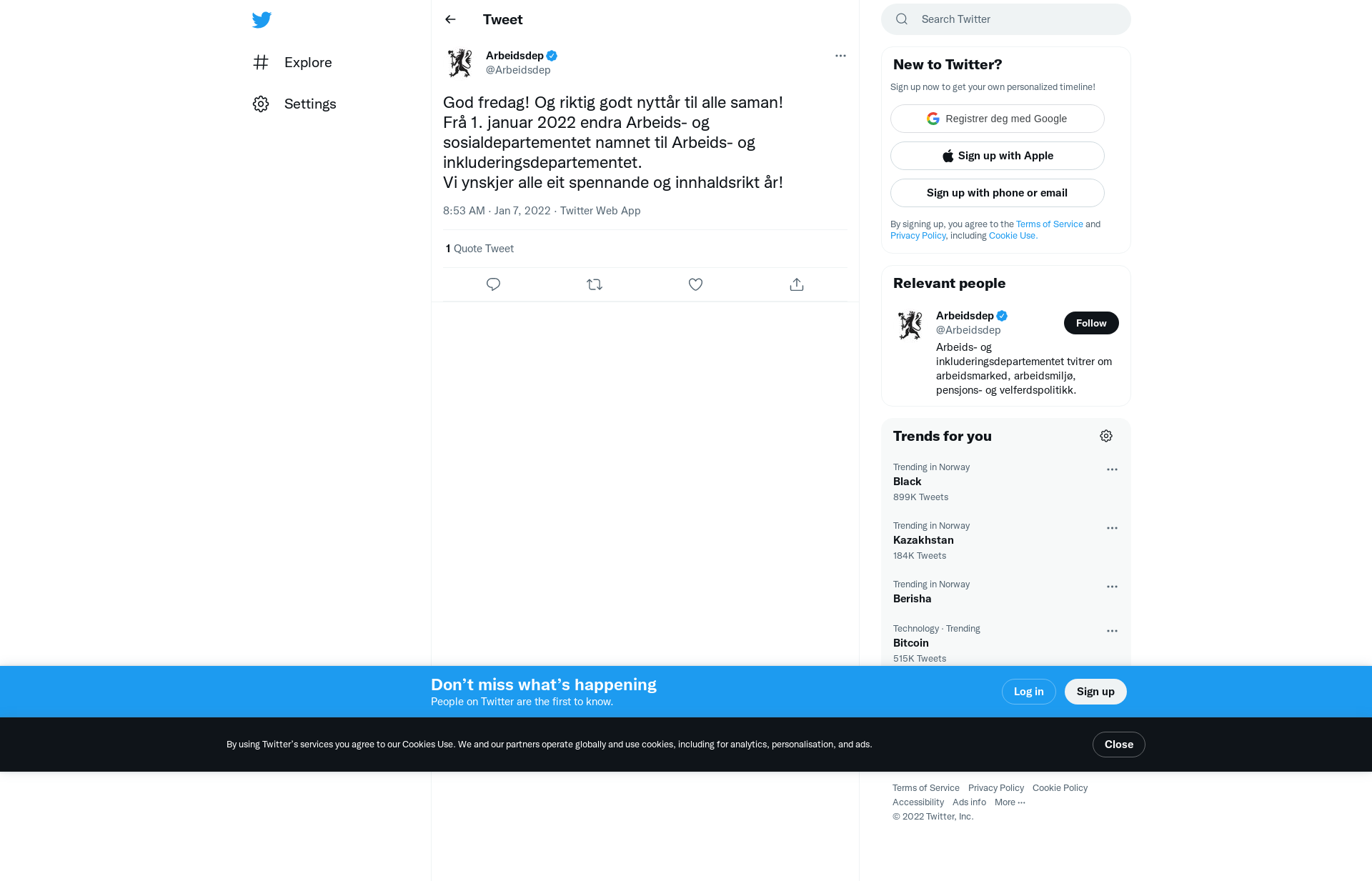 God fredag! Og riktig godt nyttår til alle saman! Frå 1. januar 2022 endra Arbeids- og sosialdepartementet namnet til Arbeids- og inkluderingsdepartementet. Vi ynskjer alle eit spennande og innhaldsrikt år!