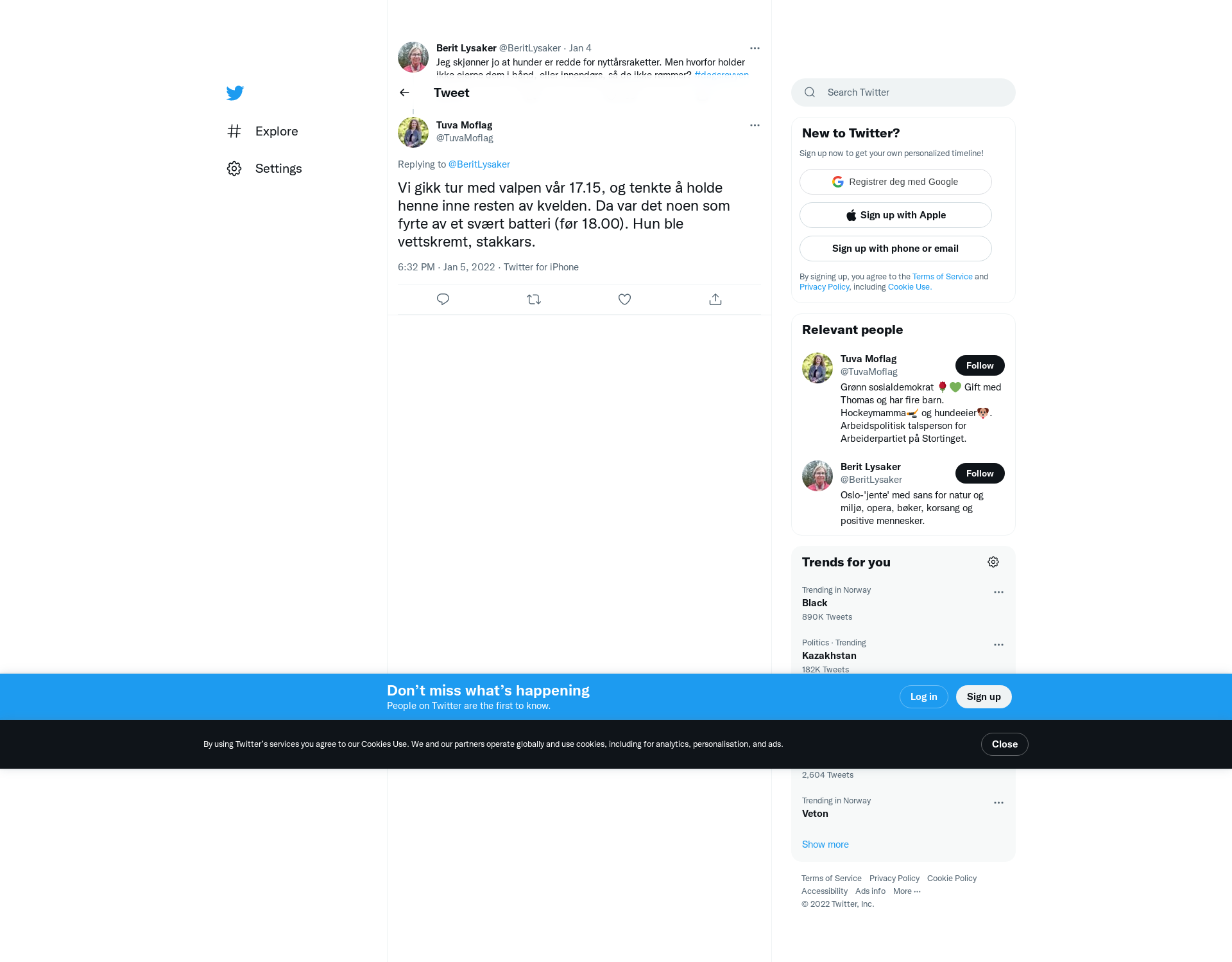 @BeritLysaker Vi gikk tur med valpen vår 17.15, og tenkte å holde henne inne resten av kvelden. Da var det noen som fyrte av et svært batteri (før 18.00). Hun ble vettskremt, stakkars.