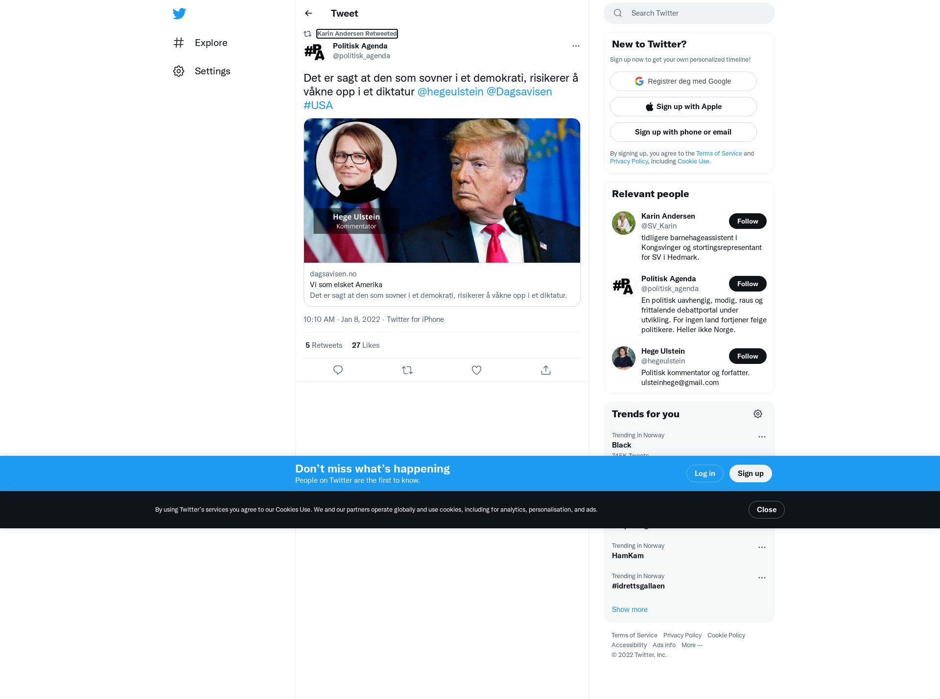 RT @politisk_agenda: Det er sagt at den som sovner i et demokrati, risikerer å våkne opp i et diktatur @hegeulstein @Dagsavisen #USA https://t.co/tFRnH44yha
