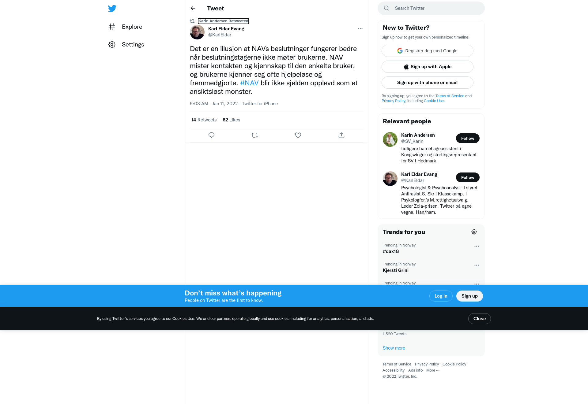 RT @KarlEldar: Det er en illusjon at NAVs beslutninger fungerer bedre når beslutningstagerne ikke møter brukerne. NAV mister kontakten og kjennskap til den enkelte bruker, og brukerne kjenner seg ofte hjelpeløse og fremmedgjorte. #NAV blir ikke sjelden opplevd som et ansiktsløst monster.
