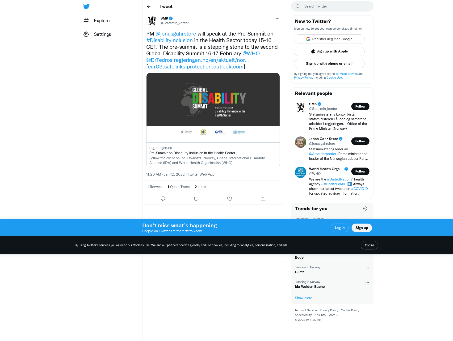 PM @jonasgahrstore will speak at the Pre-Summit on #DisabilityInclusion in the Health Sector today 15-16 CET. The pre-summit is a stepping stone to the second Global Disability Summit 16-17 February @WHO @DrTedros https://t.co/PIZkg2AH9N [https://t.co/5mpUppmRGl]
