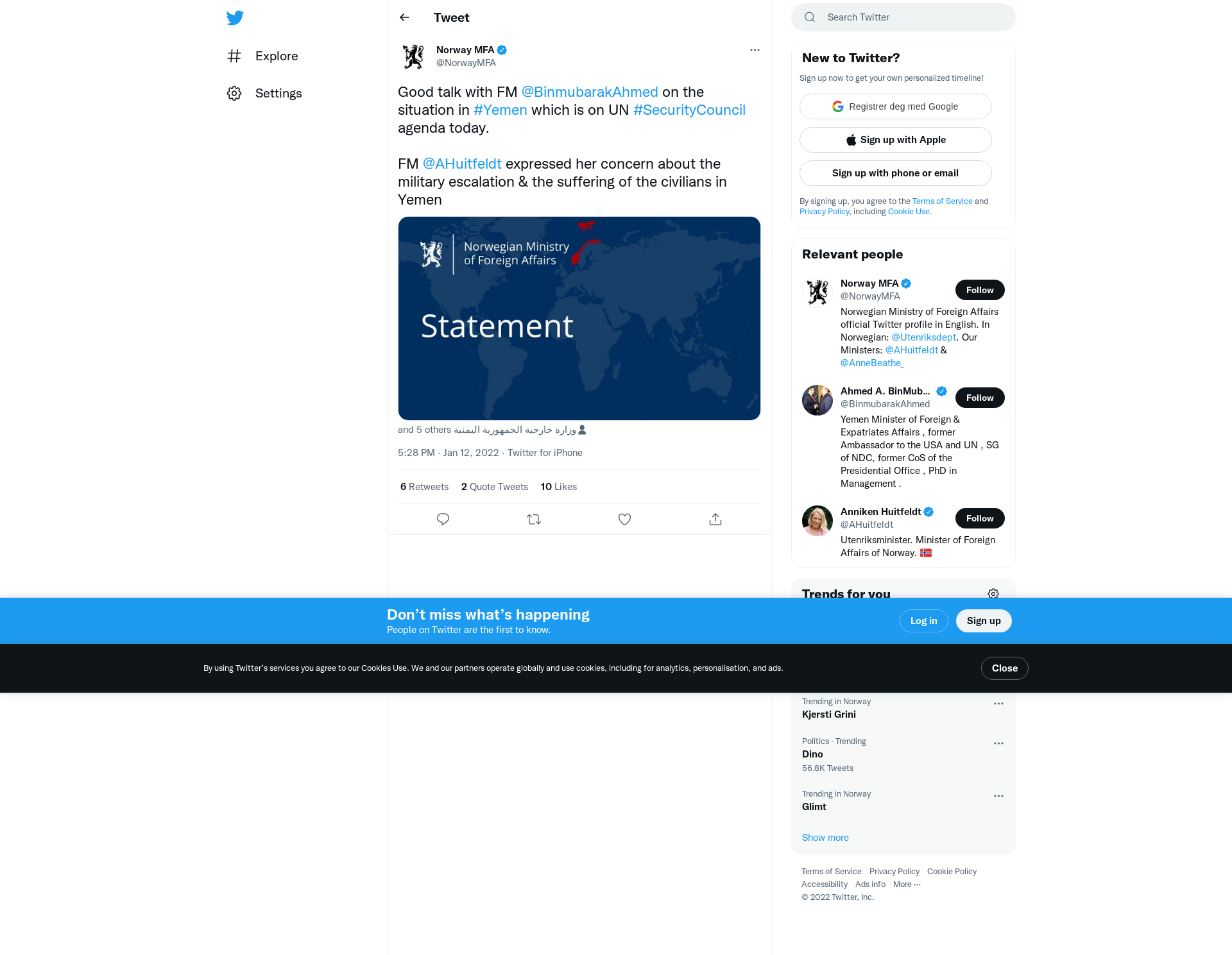 FM @AHuitfeldt expressed her concern about the military escalation & the suffering of the civilians in Yemen https://t.co/dz2Qt9XrJo