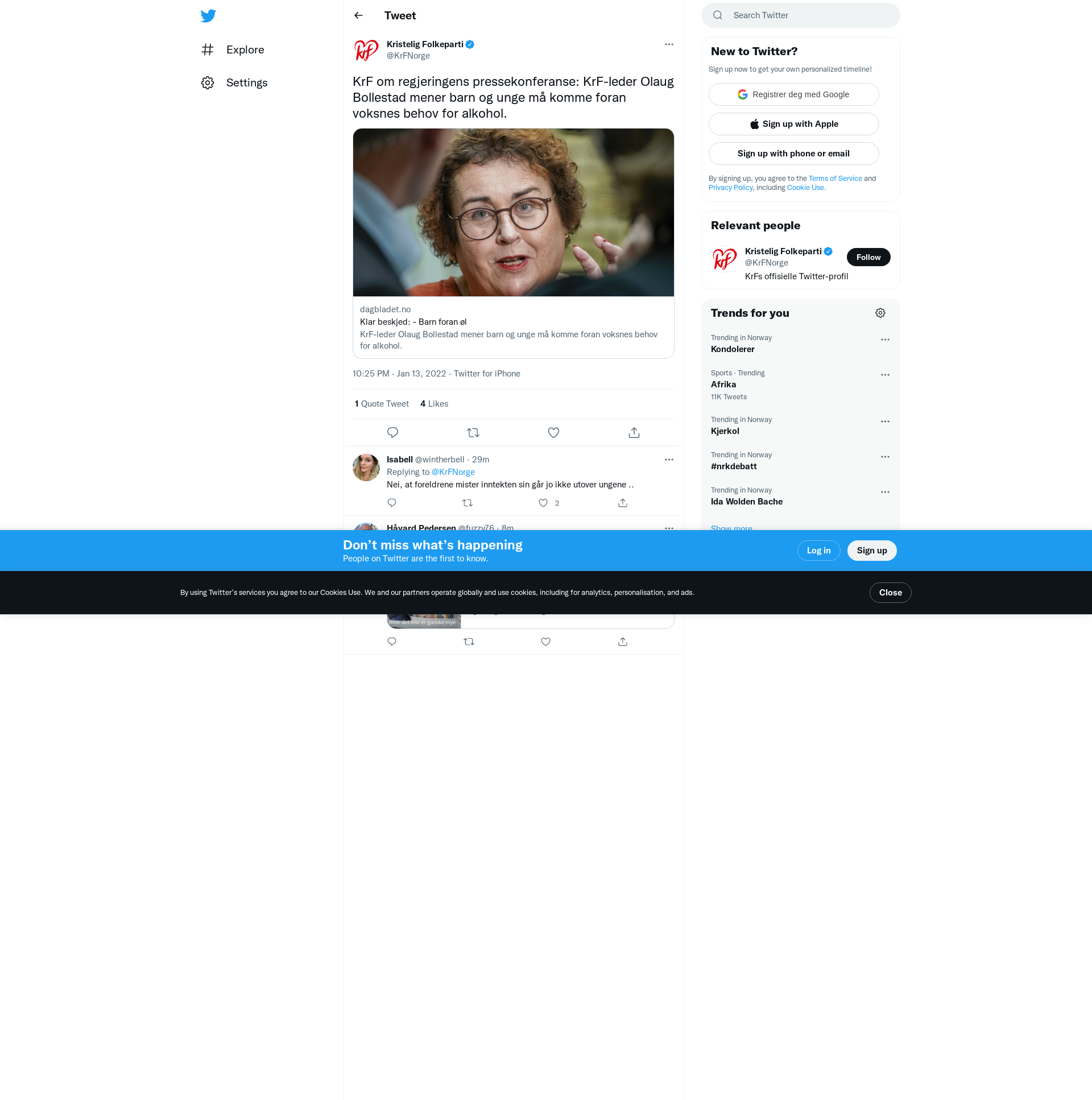 KrF om regjeringens pressekonferanse: KrF-leder Olaug Bollestad mener barn og unge må komme foran voksnes behov for alkohol. https://t.co/naDhUxjBCk