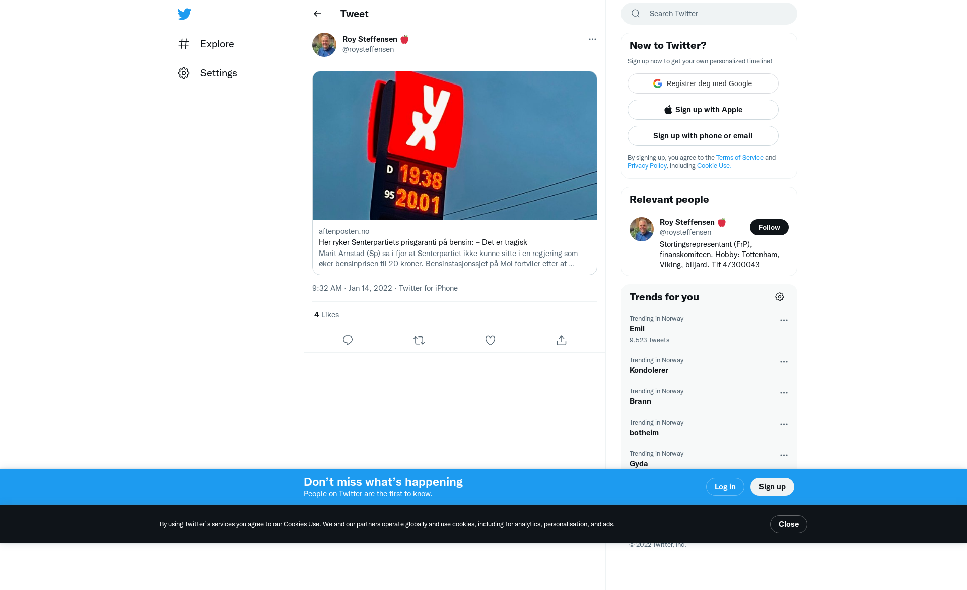 Marit Arnstad (Sp) sa i fjor at Senterpartiet ikke kunne sitte i en regjering som øker bensinprisen til 20 kroner. Bensinstasjonssjef på Moi fortviler etter at literprisen bikket 20 kroner.