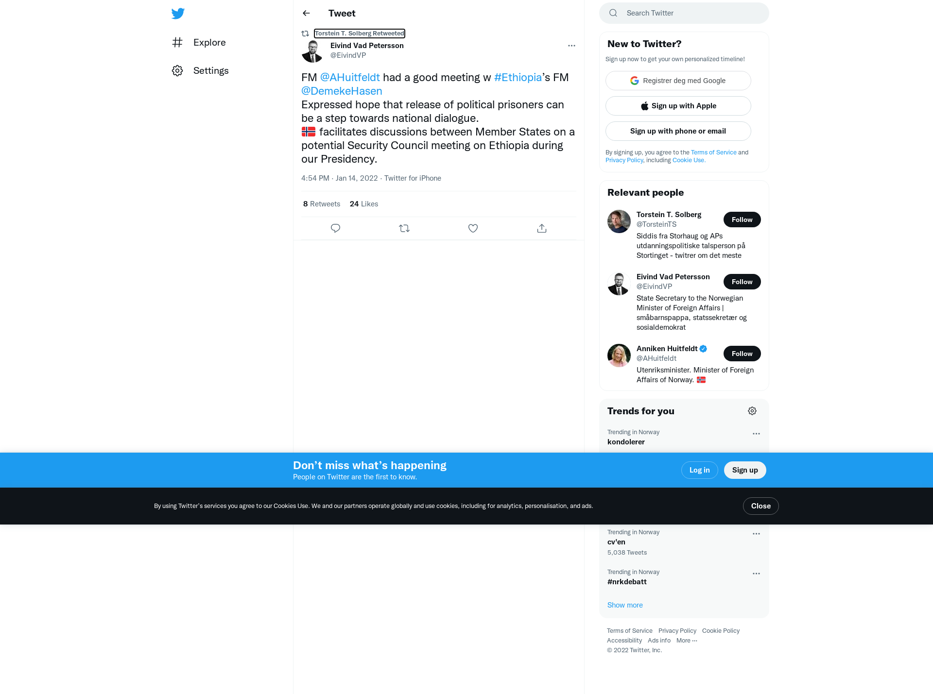 RT @EivindVP: FM @AHuitfeldt had a good meeting w #Ethiopia’s FM @DemekeHasen Expressed hope that release of political prisoners can be a s…