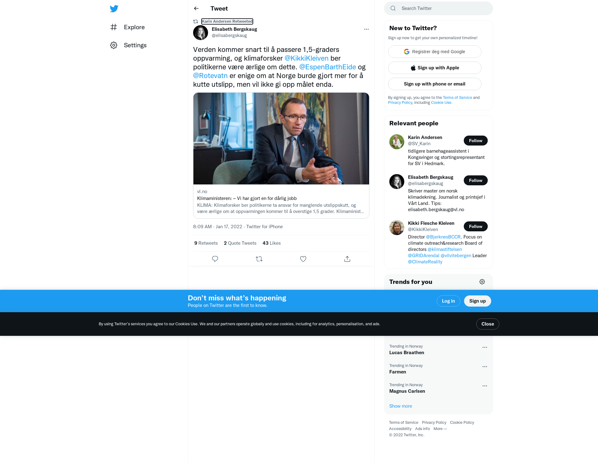 RT @elisabergskaug: Verden kommer snart til å passere 1,5-graders oppvarming, og klimaforsker @KikkiKleiven ber politikerne være ærlige om dette. @EspenBarthEide og @Rotevatn er enige om at Norge burde gjort mer for å kutte utslipp, men vil ikke gi opp målet enda. https://t.co/3gr0LoiIWt