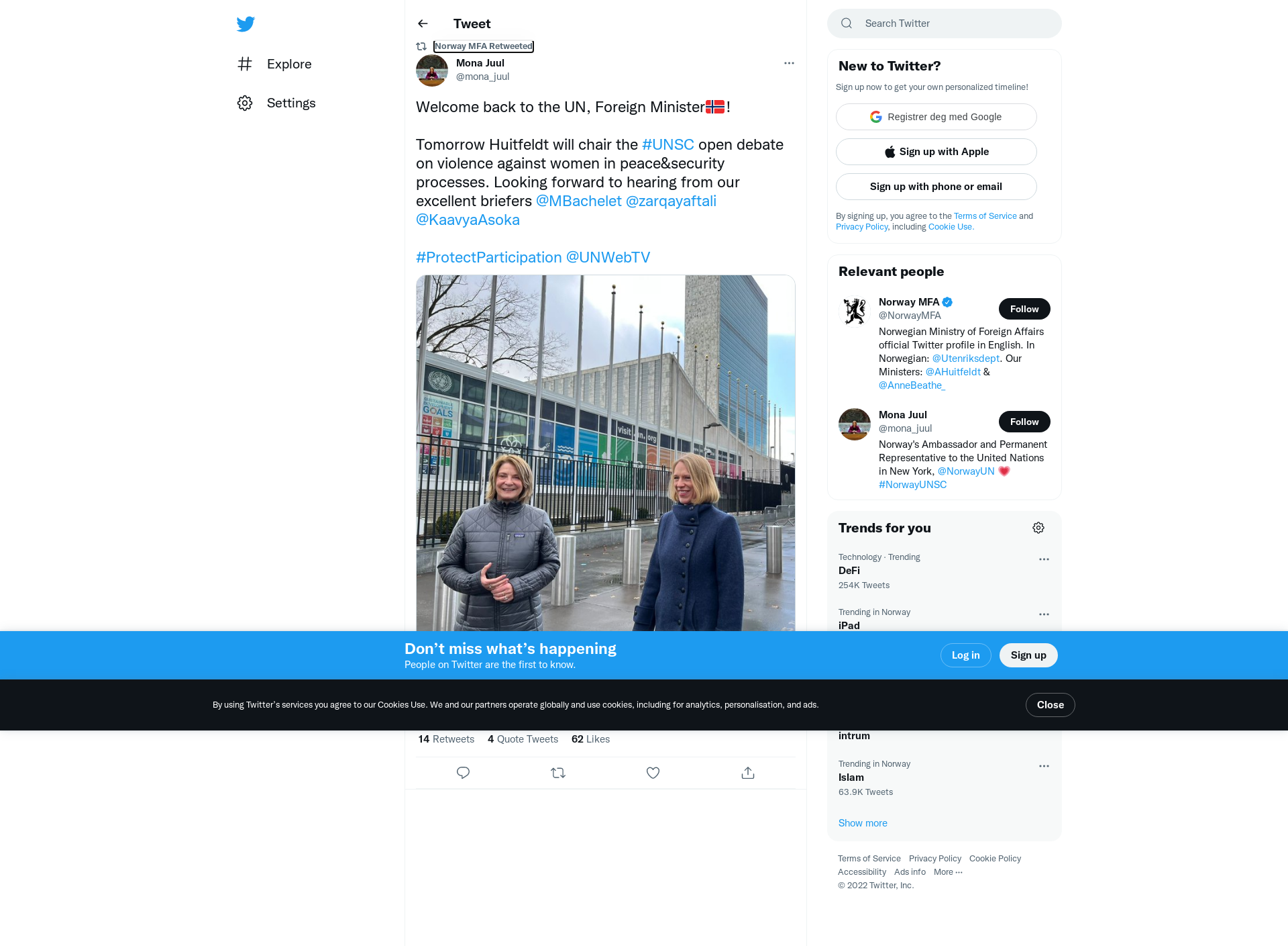RT @mona_juul: Welcome back to the UN, Foreign Minister🇳🇴! Tomorrow Huitfeldt will chair the #UNSC open debate on violence against women i…