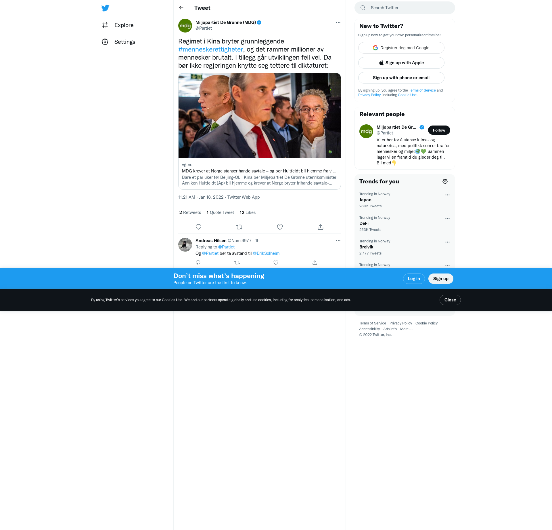 MDG krever at Norge stanser handelsavtale – og ber Huitfeldt bli hjemme fra vinter-OL