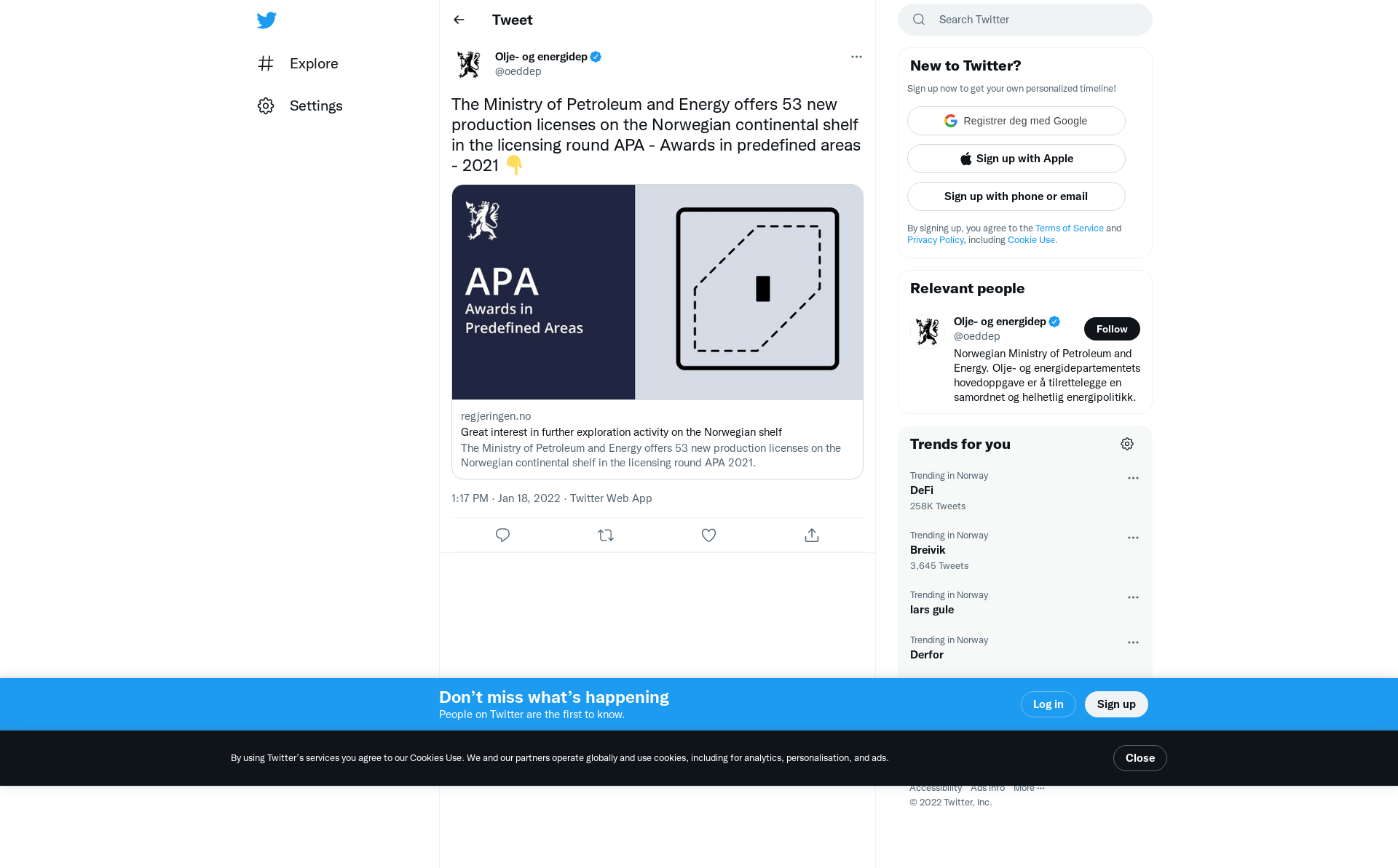 The Ministry of Petroleum and Energy offers 53 new production licenses on the Norwegian continental shelf in the licensing round APA - Awards in predefined areas - 2021 👇 https://t.co/jXiZyyLWip