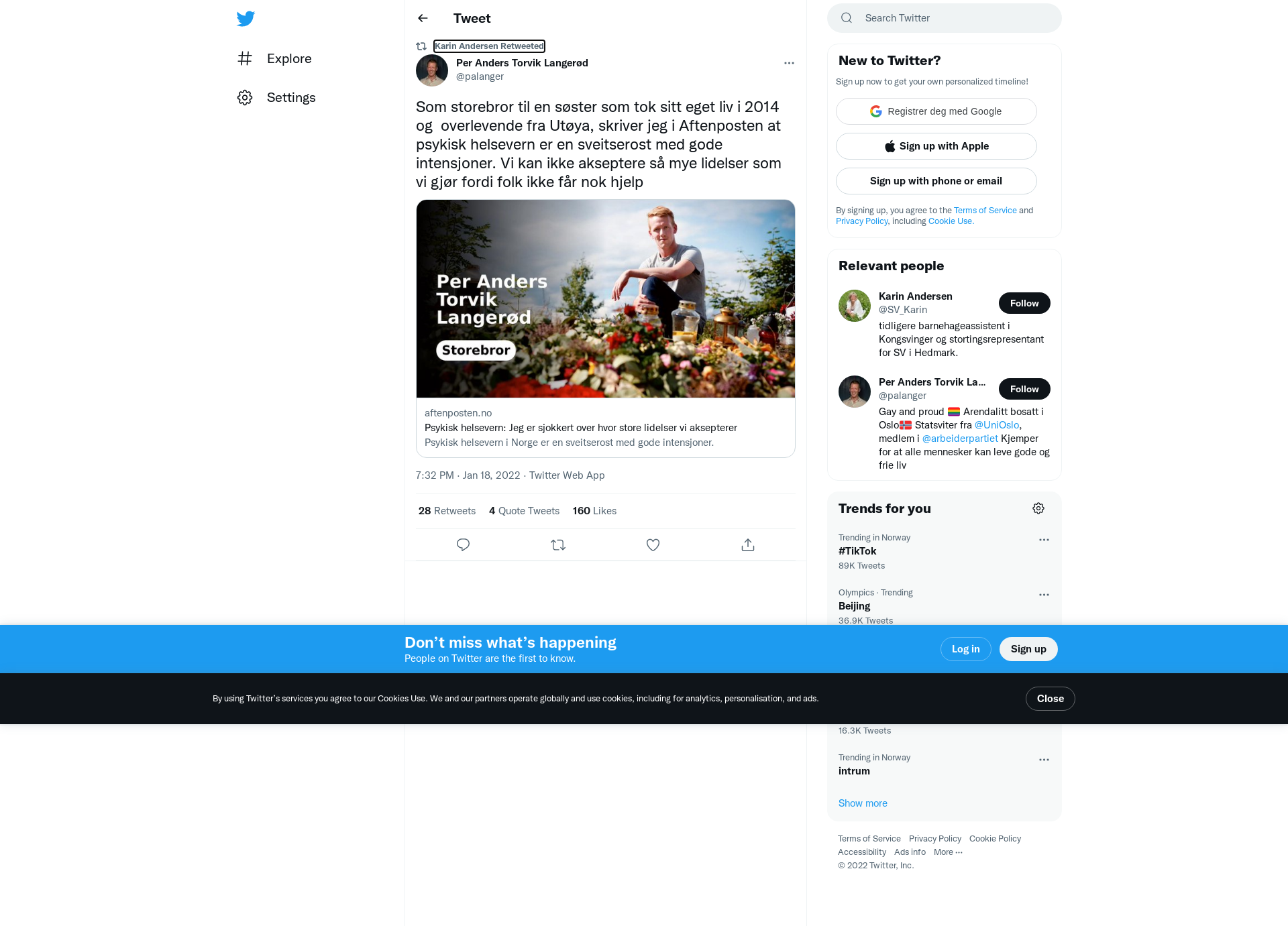 RT @palanger: Som storebror til en søster som tok sitt eget liv i 2014 og overlevende fra Utøya, skriver jeg i Aftenposten at psykisk helsevern er en sveitserost med gode intensjoner. Vi kan ikke akseptere så mye lidelser som vi gjør fordi folk ikke får nok hjelp https://t.co/PSth5zvwhU