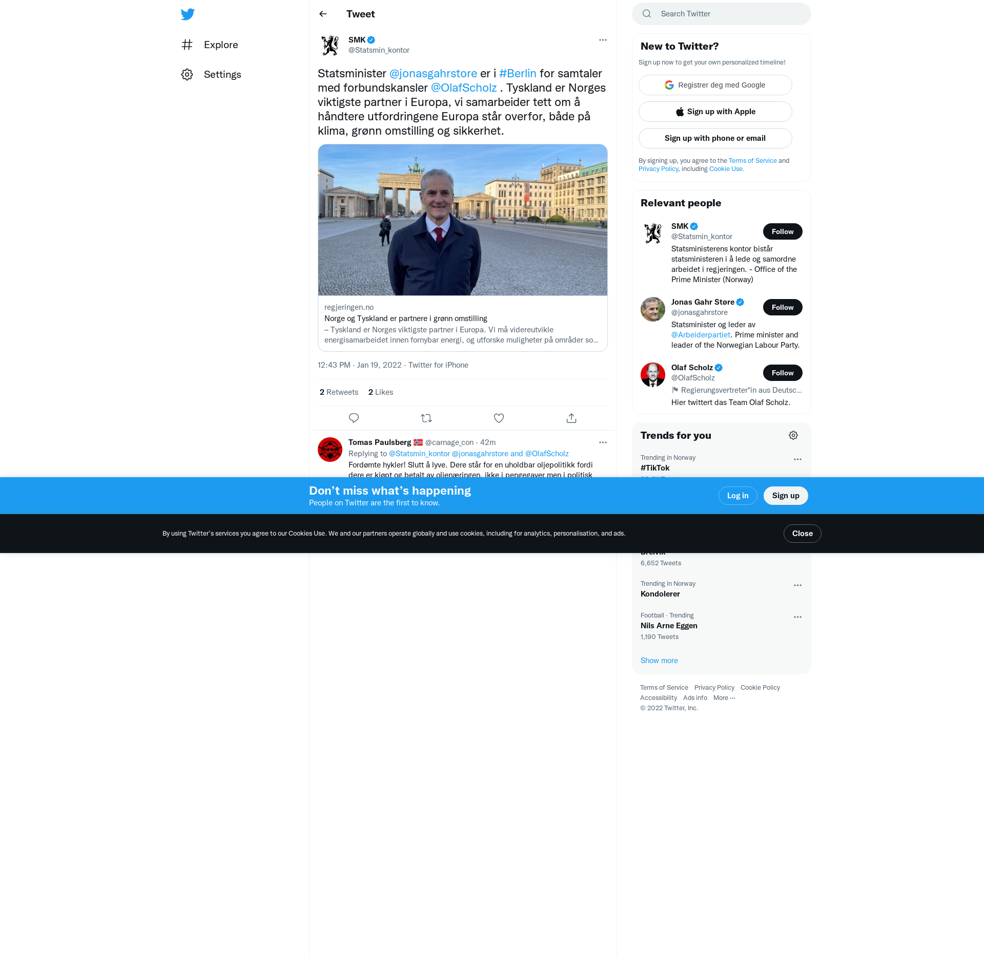 Statsminister @jonasgahrstore er i #Berlin for samtaler med forbundskansler @OlafScholz . Tyskland er Norges viktigste partner i Europa, vi samarbeider tett om å håndtere utfordringene Europa står overfor, både på klima, grønn omstilling og sikkerhet.