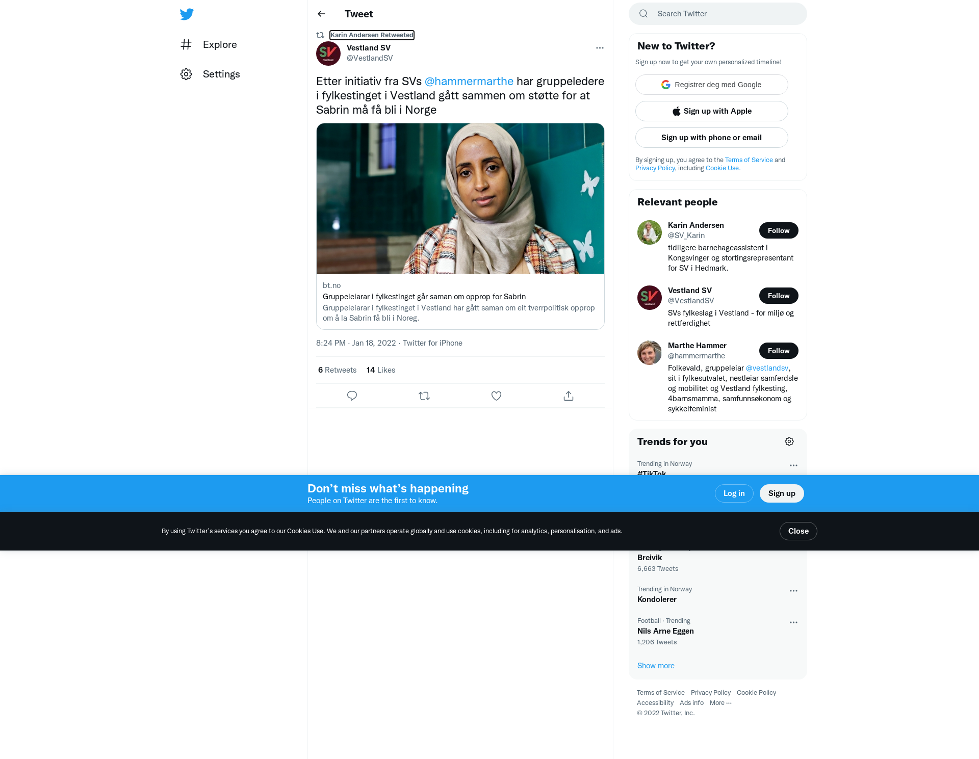 RT @VestlandSV: Etter initiativ fra SVs @hammermarthe har gruppeledere i fylkestinget i Vestland gått sammen om støtte for at Sabrin må få bli i Norge https://t.co/ThJHwQT3sA