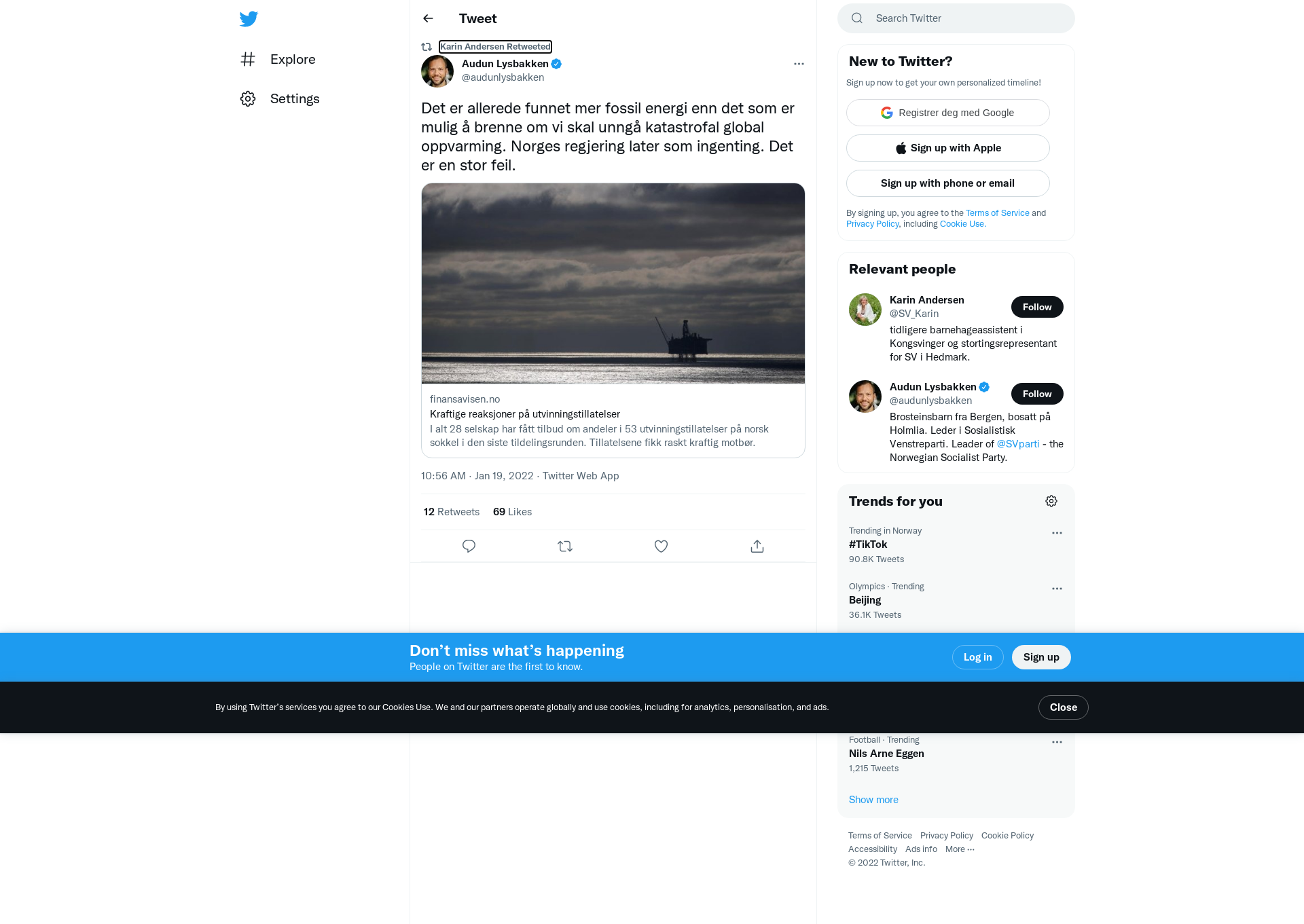 RT @audunlysbakken: Det er allerede funnet mer fossil energi enn det som er mulig å brenne om vi skal unngå katastrofal global oppvarming. Norges regjering later som ingenting. Det er en stor feil. https://t.co/sqIFVRzem2