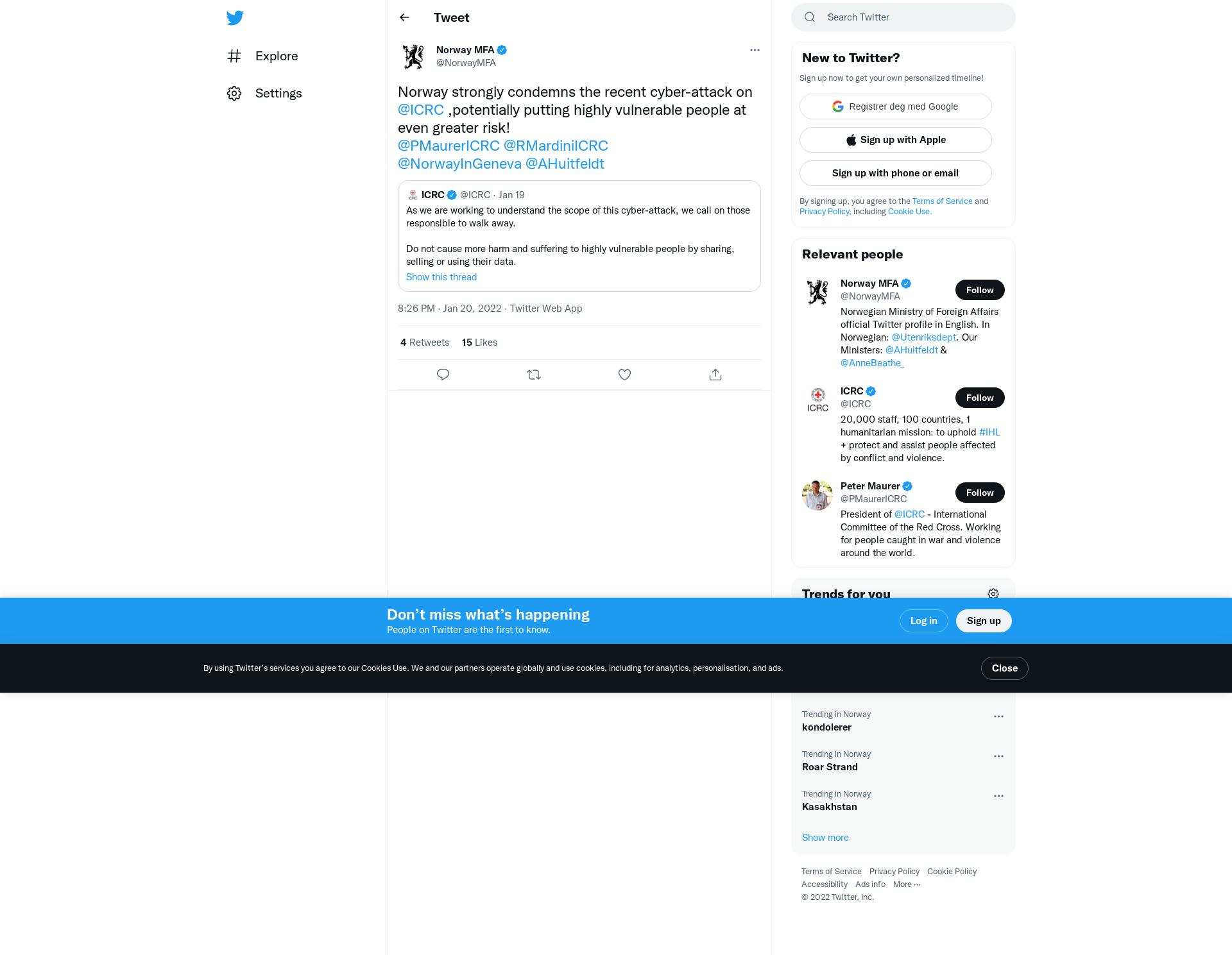 Norway strongly condemns the recent cyber-attack on @ICRC ,potentially putting highly vulnerable people at even greater risk! @PMaurerICRC @RMardiniICRC @NorwayInGeneva @AHuitfeldt