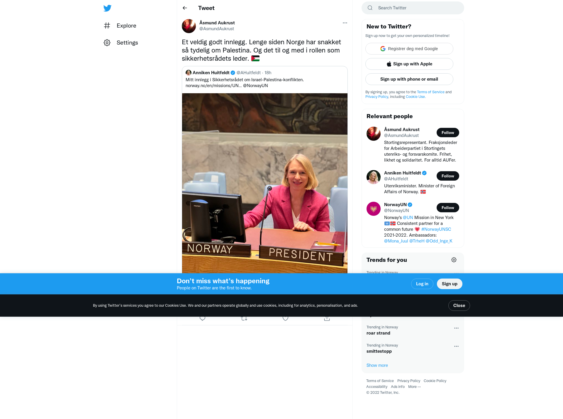 Statement by Minister for Foreign Affairs Anniken Huitfeldt in the Open Debate of the Security Council on the situation in the Middle East, 19 January 2022. Thank you Special Coordinator Tor Wennesland for your briefing. I also want to thank Gidon Bromberg and Nada Majdalani from EcoPeace for being here today. Your climate and security work is a good example of how important it is to support regional and local peacebuilding and trust building initiatives, and how addressing shared problems can be a