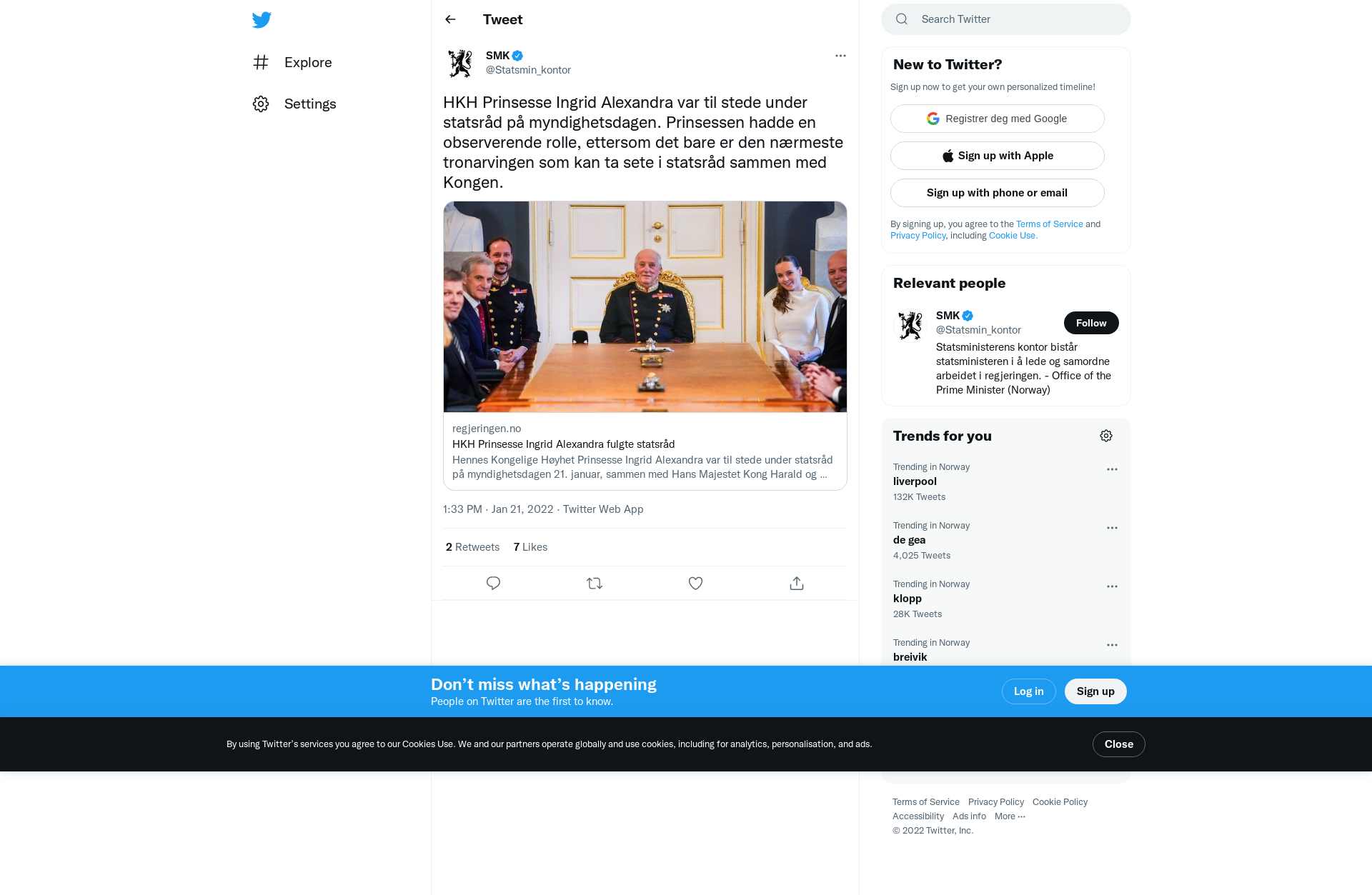 Hennes Kongelige Høyhet Prinsesse Ingrid Alexandra var til stede under statsråd på myndighetsdagen 21. januar, sammen med Hans Majestet Kong Harald og Hans Kongelige Høyhet Kronprins Haakon.