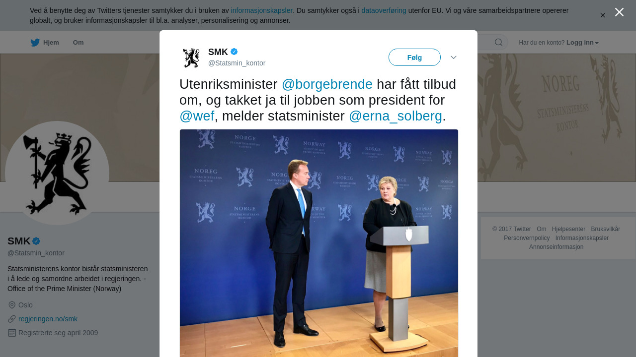 Utenriksminister @borgebrende har fått tilbud om, og takket ja til jobben som president for @wef, melder statsminis… https://t.co/iwcwAFKGid