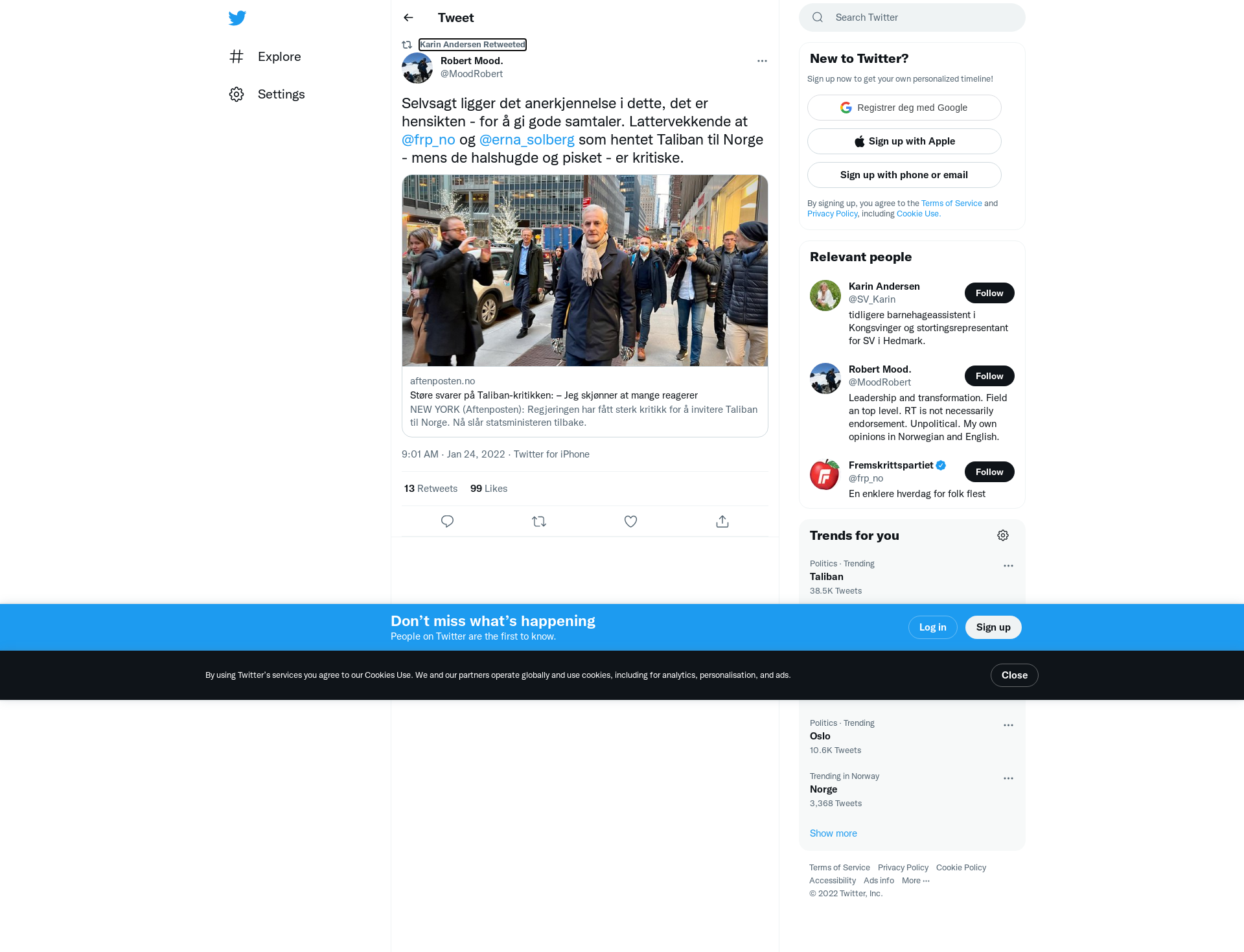 RT @MoodRobert: Selvsagt ligger det anerkjennelse i dette, det er hensikten - for å gi gode samtaler. Lattervekkende at @frp_no og @erna_solberg som hentet Taliban til Norge - mens de halshugde og pisket - er kritiske. https://t.co/lQMLNfRONV