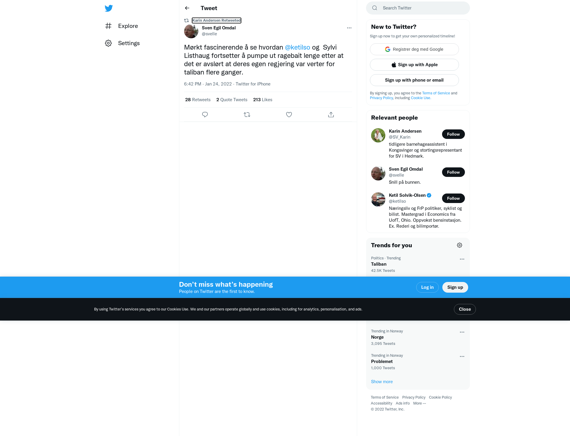 RT @svelle: Mørkt fascinerende å se hvordan @ketilso og Sylvi Listhaug fortsetter å pumpe ut ragebait lenge etter at det er avslørt at deres egen regjering var verter for taliban flere ganger.