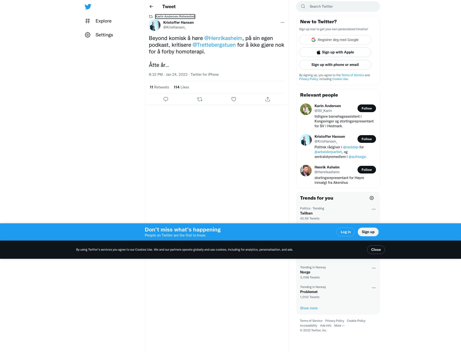 RT @KrisHansen_: Beyond komisk å høre @Henrikasheim, på sin egen podkast, kritisere @Trettebergstuen for å ikke gjøre nok for å forby homoterapi. Åtte år…