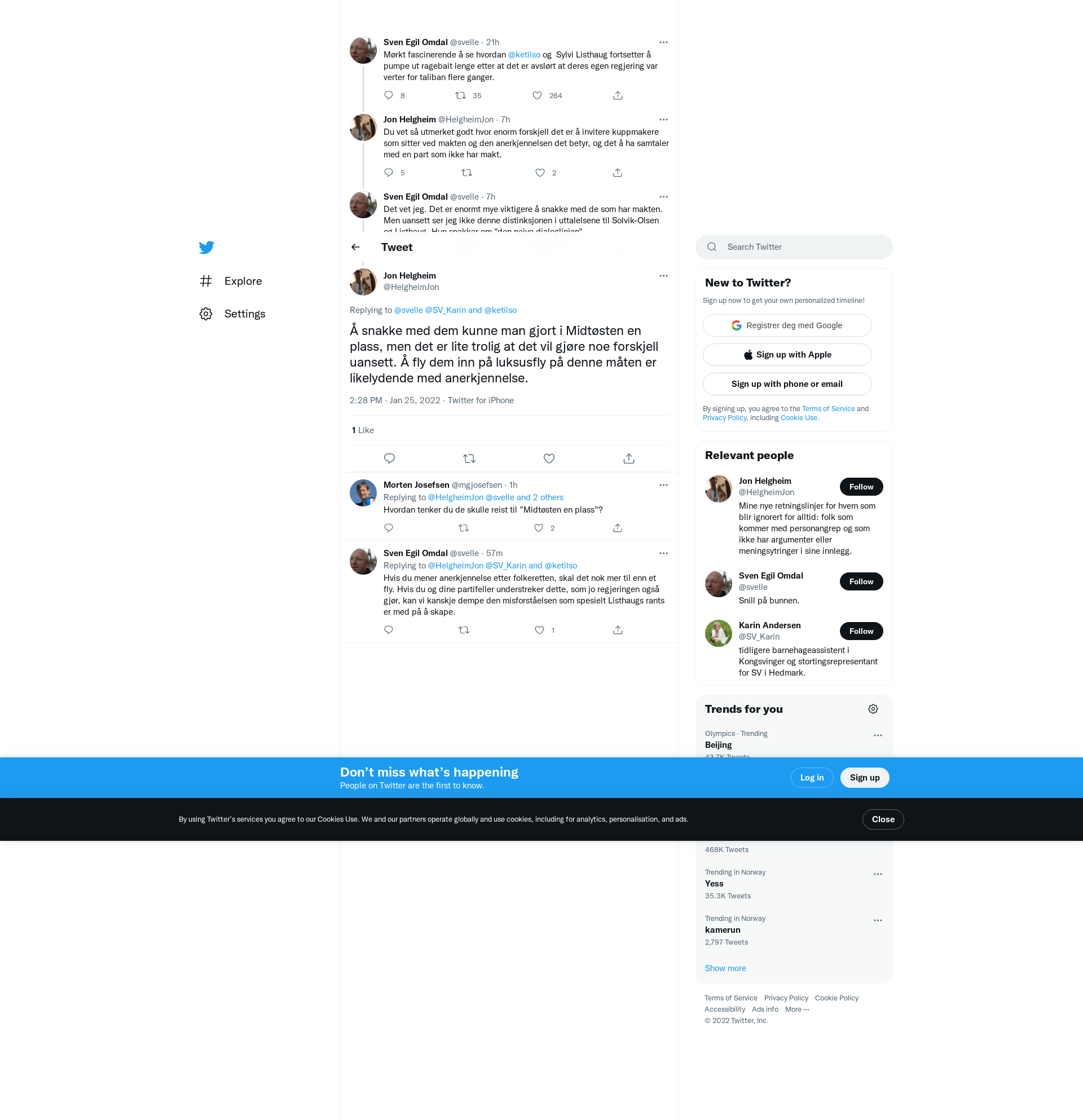 @svelle @SV_Karin @ketilso Å snakke med dem kunne man gjort i Midtøsten en plass, men det er lite trolig at det vil gjøre noe forskjell uansett. Å fly dem inn på luksusfly på denne måten er likelydende med anerkjennelse.