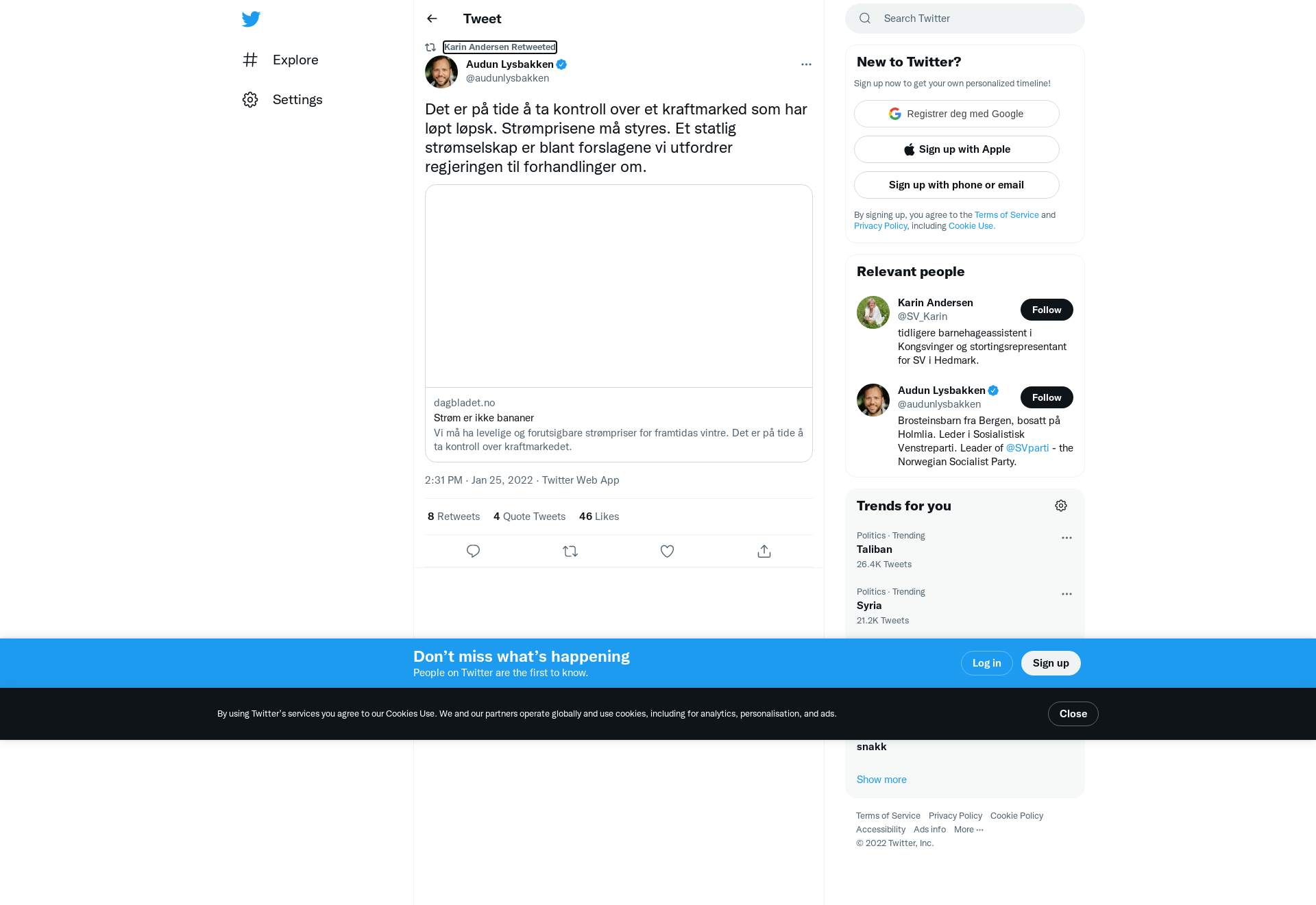 RT @audunlysbakken: Det er på tide å ta kontroll over et kraftmarked som har løpt løpsk. Strømprisene må styres. Et statlig strømselskap er blant forslagene vi utfordrer regjeringen til forhandlinger om. https://t.co/XtucZuFSoR
