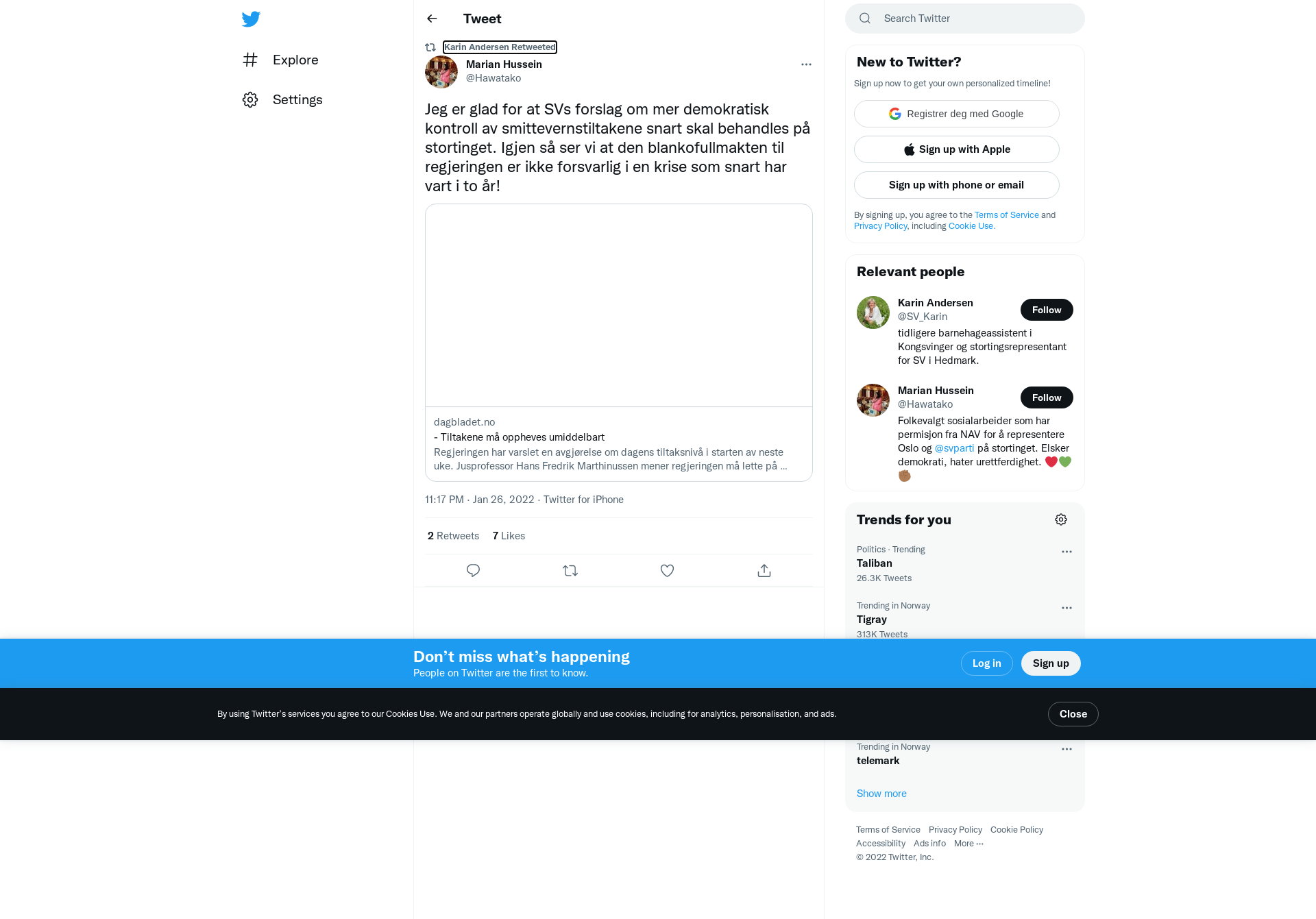 RT @Hawatako: Jeg er glad for at SVs forslag om mer demokratisk kontroll av smittevernstiltakene snart skal behandles på stortinget. Igjen så ser vi at den blankofullmakten til regjeringen er ikke forsvarlig i en krise som snart har vart i to år! https://t.co/0ZrFyOgY8b