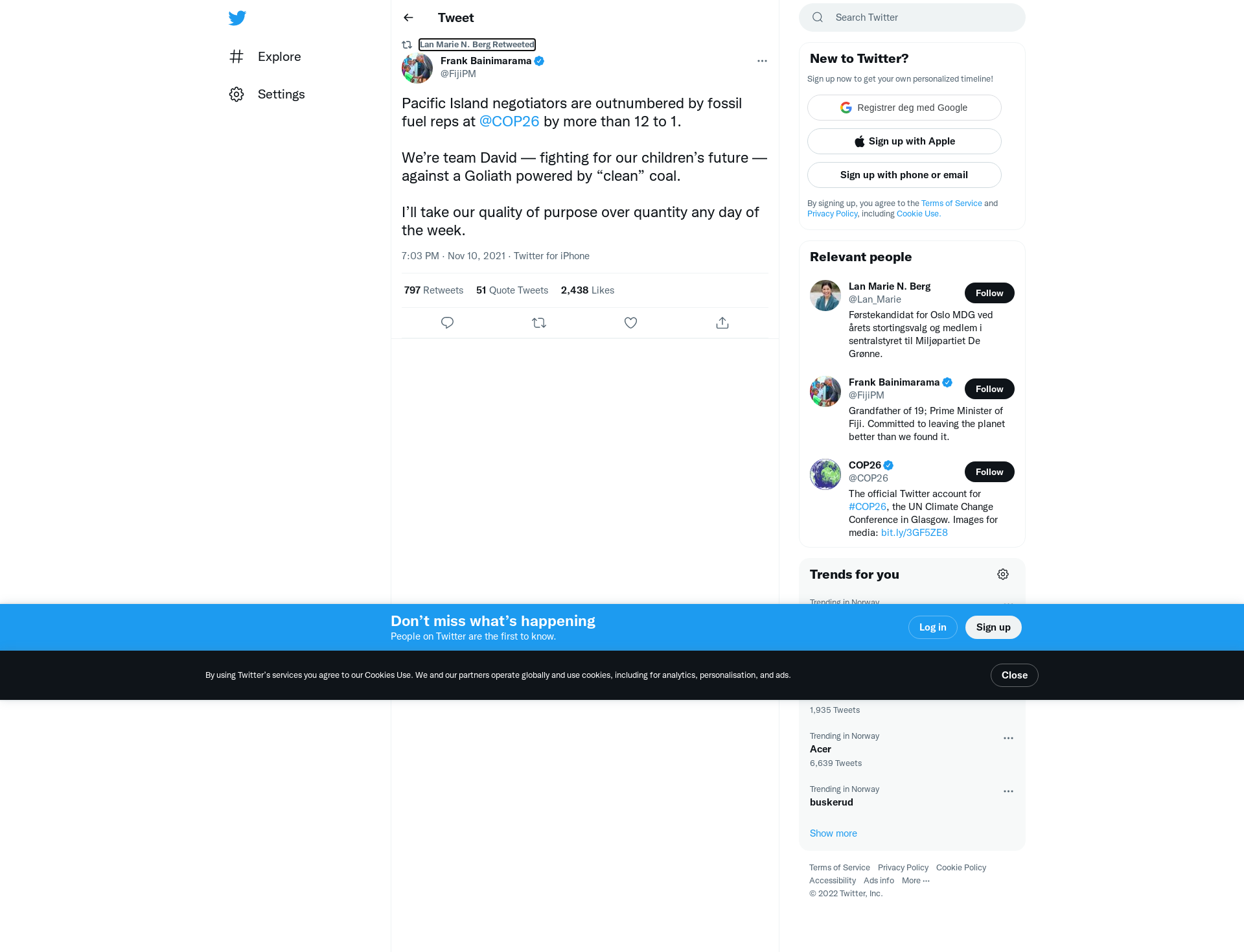 RT @FijiPM: Pacific Island negotiators are outnumbered by fossil fuel reps at @COP26 by more than 12 to 1.\n\nWe’re team David — fighting for…