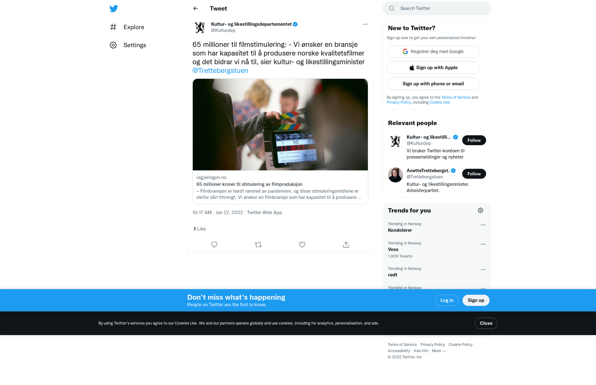 – Filmbransjen er hardt rammet av pandemien, og disse stimuleringsmidlene er derfor sårt tiltrengt. Vi ønsker en filmbransje som har kapasitet til å produsere norske kvalitetsfilmer og det bidrar vi nå til, sier kultur- og likestillingsminister Anette ...