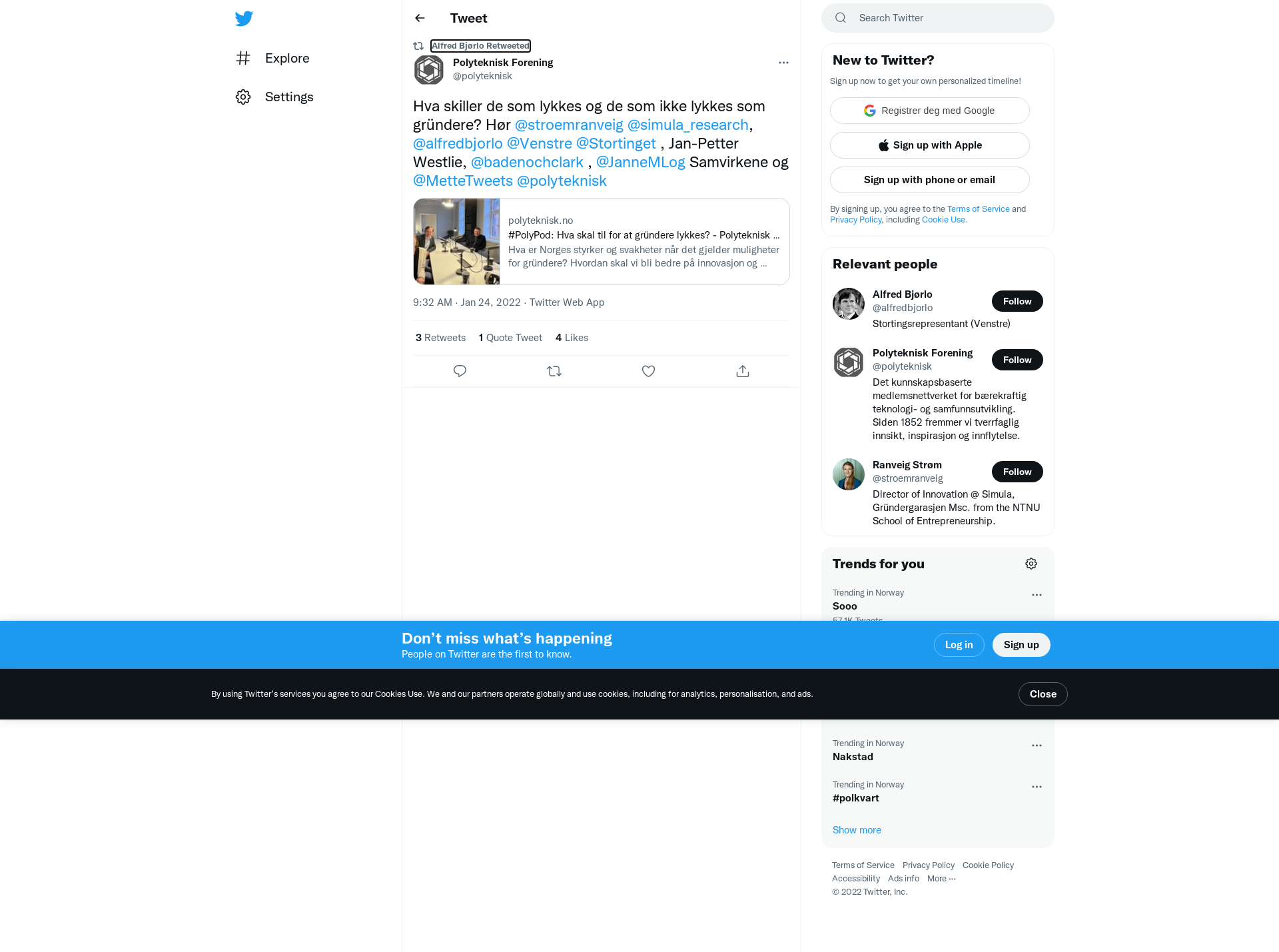 RT @polyteknisk: Hva skiller de som lykkes og de som ikke lykkes som gründere? Hør @stroemranveig @simula_research, @alfredbjorlo @Venstre @Stortinget , Jan-Petter Westlie, @badenochclark , @JanneMLog Samvirkene og @MetteTweets @polyteknisk https://t.co/GVLmcp7UN7