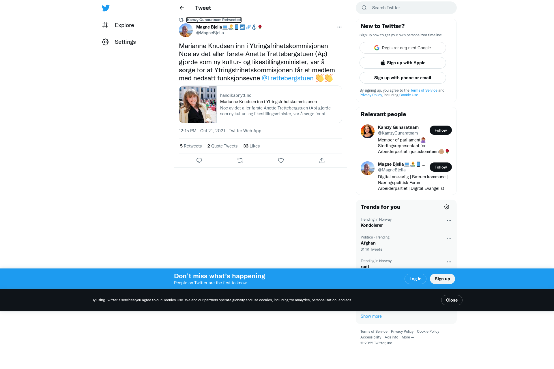 RT @MagneBjella: Marianne Knudsen inn i Ytringsfrihetskommisjonen\nNoe av det aller første Anette Trettebergstuen (Ap) gjorde som ny kultur-…