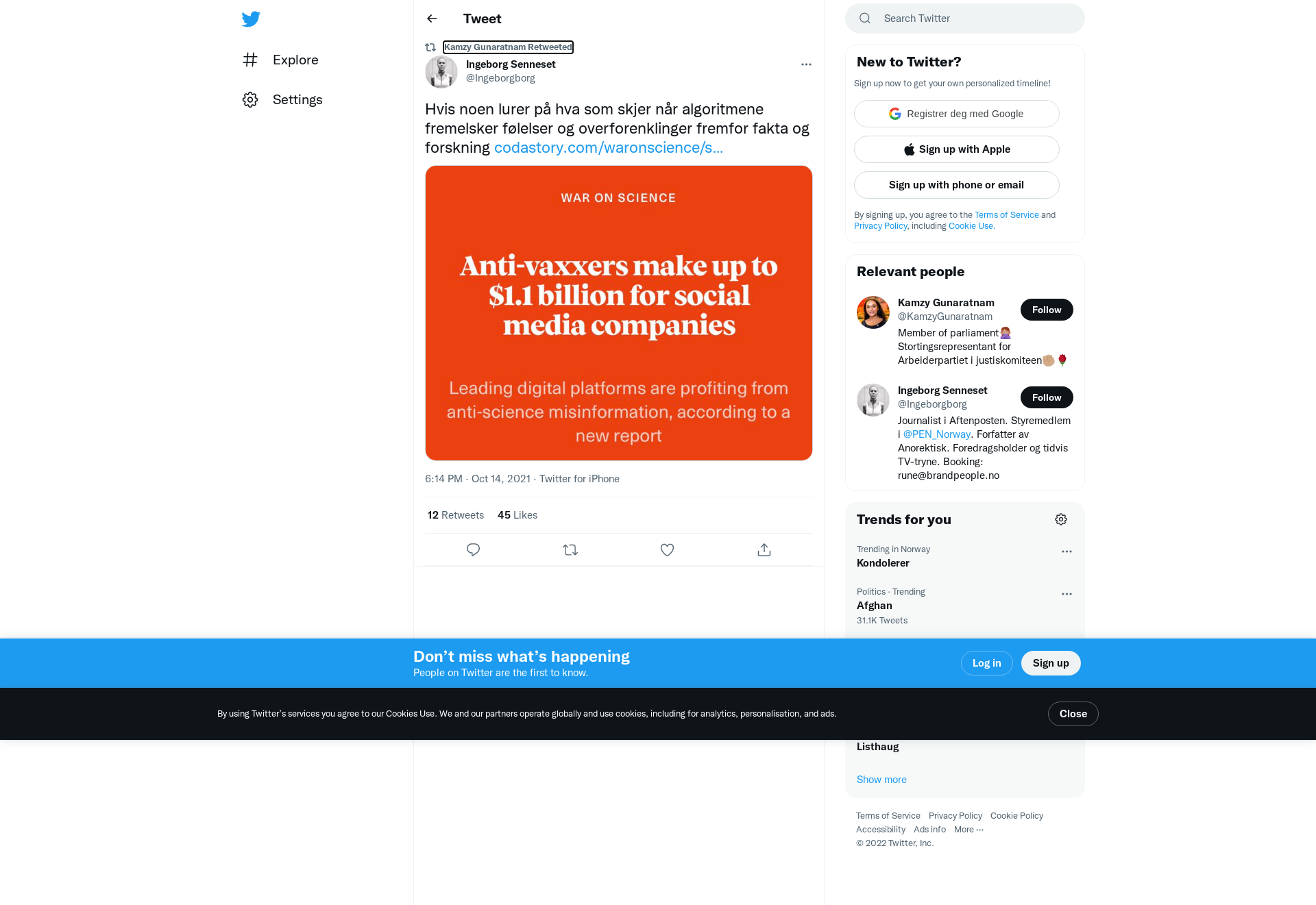 RT @Ingeborgborg: Hvis noen lurer på hva som skjer når algoritmene fremelsker følelser og overforenklinger fremfor fakta og forskning https://t.co/JwJNUgQLPW https://t.co/kid158qwsf