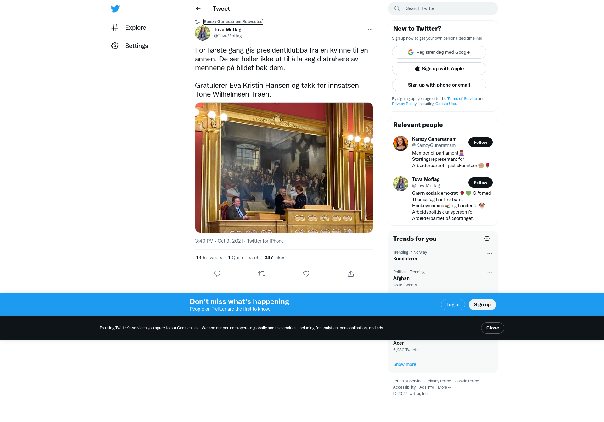 RT @TuvaMoflag: For første gang gis presidentklubba fra en kvinne til en annen. De ser heller ikke ut til å la seg distrahere av mennene på bildet bak dem. \n\nGratulerer Eva Kristin Hansen og takk for innsatsen Tone Wilhelmsen Trøen. https://t.co/rnbPVdC0An