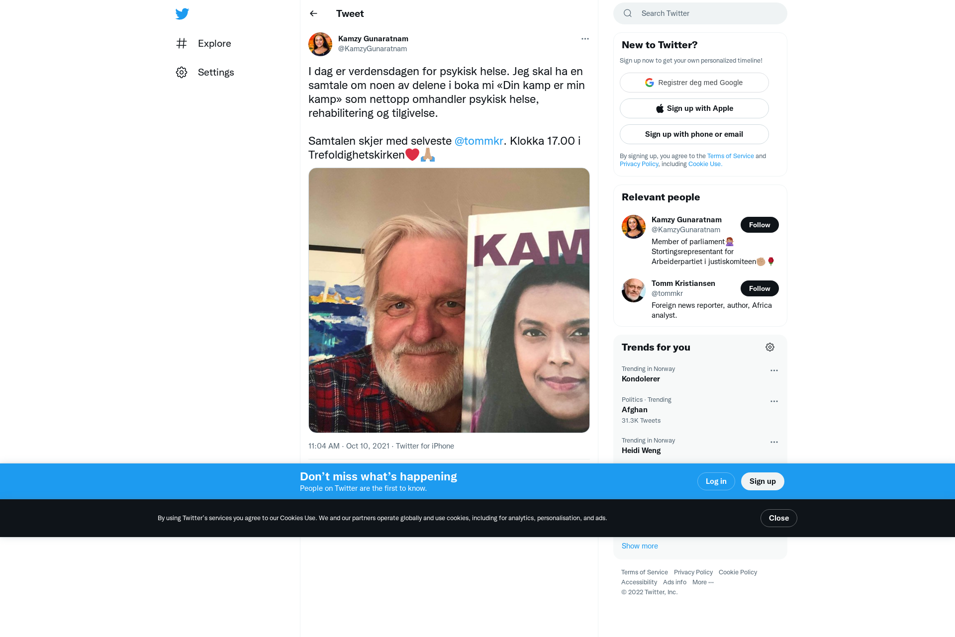 I dag er verdensdagen for psykisk helse. Jeg skal ha en samtale om noen av delene i boka mi «Din kamp er min kamp» som nettopp omhandler psykisk helse, rehabilitering og tilgivelse.\n\nSamtalen skjer med selveste @tommkr. Klokka 17.00 i Trefoldighetskirken❤️🙏🏽 https://t.co/EzSrJopnnL