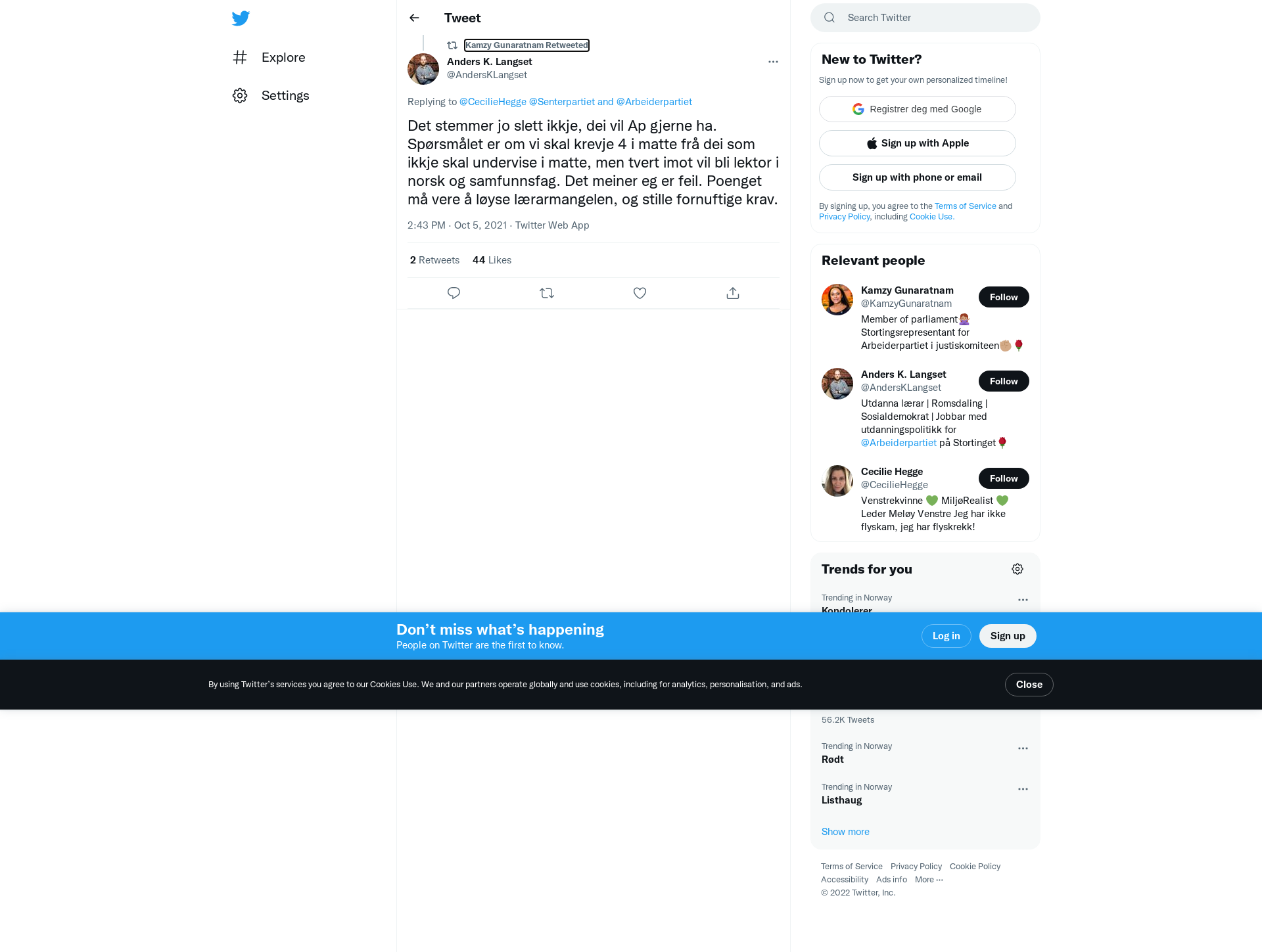 RT @AndersKLangset: @CecilieHegge @Senterpartiet @Arbeiderpartiet Det stemmer jo slett ikkje, dei vil Ap gjerne ha. Spørsmålet er om vi skal krevje 4 i matte frå dei som ikkje skal undervise i matte, men tvert imot vil bli lektor i norsk og samfunnsfag. Det meiner eg er feil. Poenget må vere å løyse lærarmangelen, og stille fornuftige krav.