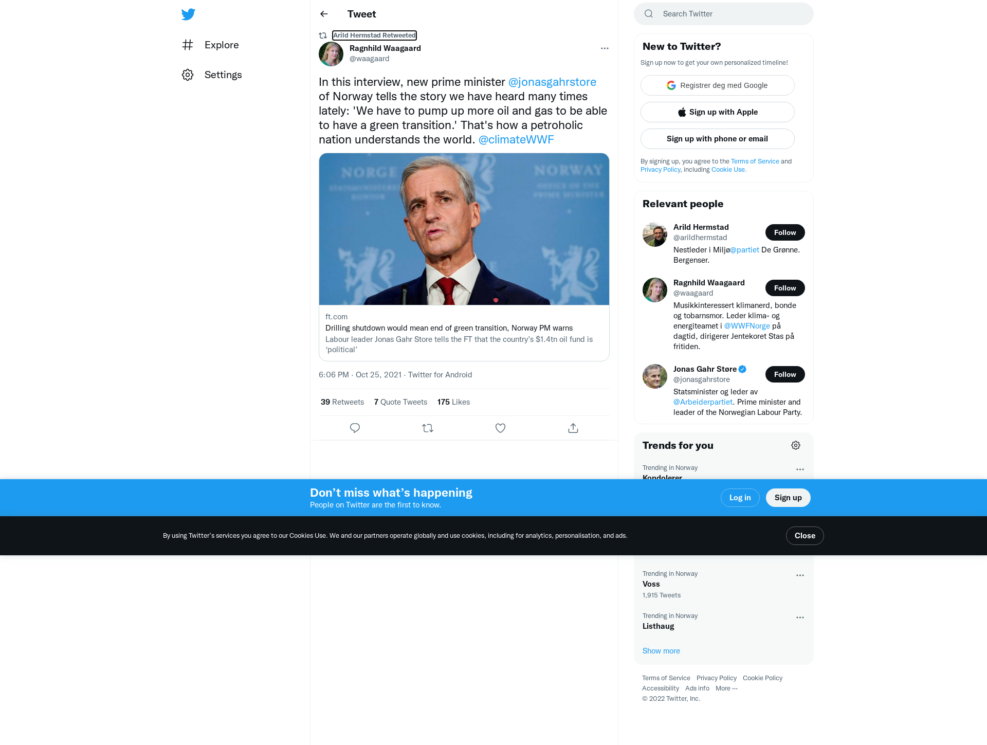 RT @waagaard: In this interview, new prime minister @jonasgahrstore of Norway tells the story we have heard many times lately: 'We have to pump up more oil and gas to be able to have a green transition.' That's how a petroholic nation understands the world. @climateWWF https://t.co/grAlHxz6do