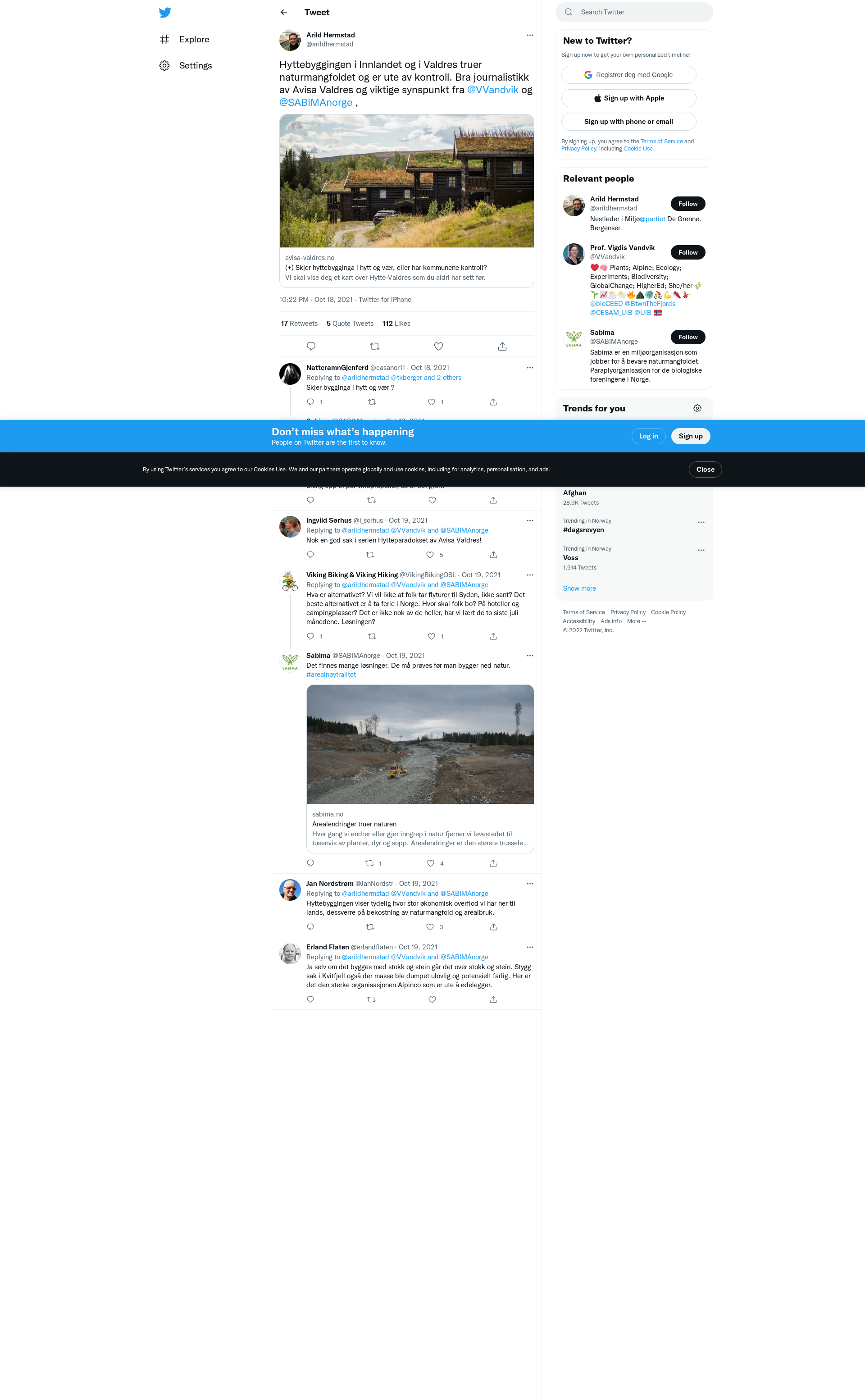 Hyttebyggingen i Innlandet og i Valdres truer naturmangfoldet og er ute av kontroll. Bra journalistikk av Avisa Valdres og viktige synspunkt fra @VVandvik og @SABIMAnorge , https://t.co/3bPBTqWz6S