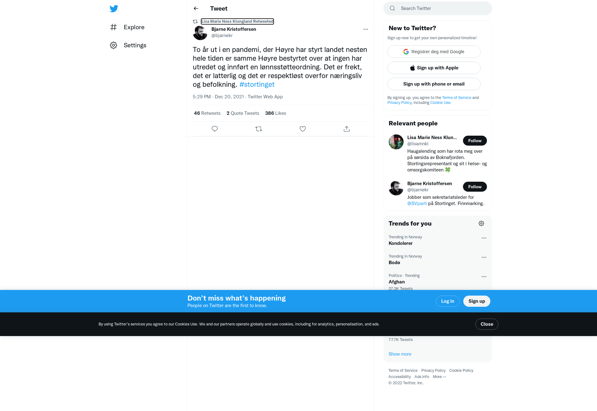 RT @bjarnekr: To år ut i en pandemi, der Høyre har styrt landet nesten hele tiden er samme Høyre bestyrtet over at ingen har utredet og innført en lønnsstøtteordning. Det er frekt, det er latterlig og det er respektløst overfor næringsliv og befolkning. #stortinget