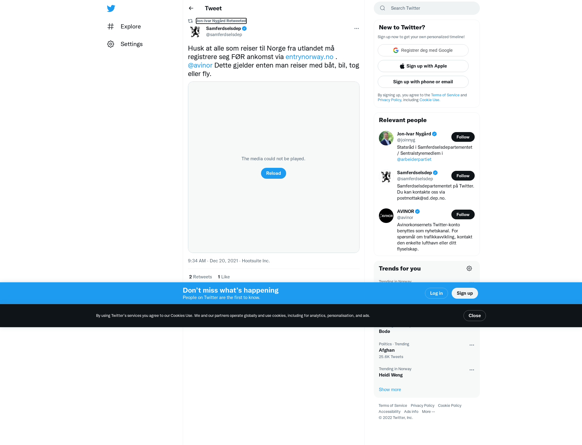 RT @samferdselsdep: Husk at alle som reiser til Norge fra utlandet må registrere seg FØR ankomst via https://t.co/KjSx95l6On . @avinor Dette gjelder enten man reiser med båt, bil, tog eller fly. https://t.co/WmO88PU9Oc
