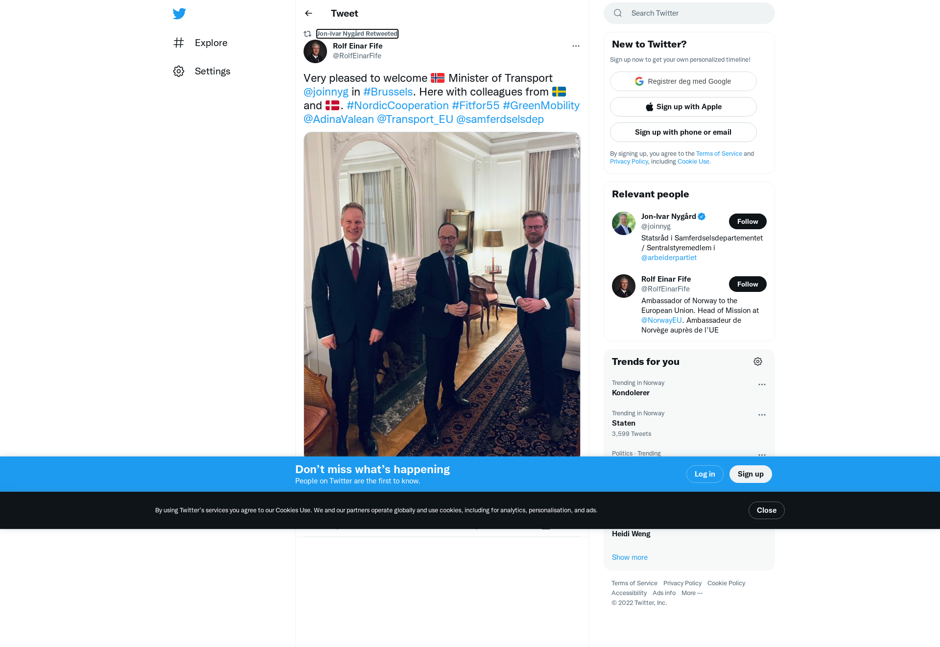 RT @RolfEinarFife: Very pleased to welcome 🇳🇴 Minister of Transport @joinnyg in #Brussels. Here with colleagues from 🇸🇪 and 🇩🇰. #NordicCooperation #Fitfor55 #GreenMobility @AdinaValean @Transport_EU @samferdselsdep https://t.co/eOn1PNXhVY