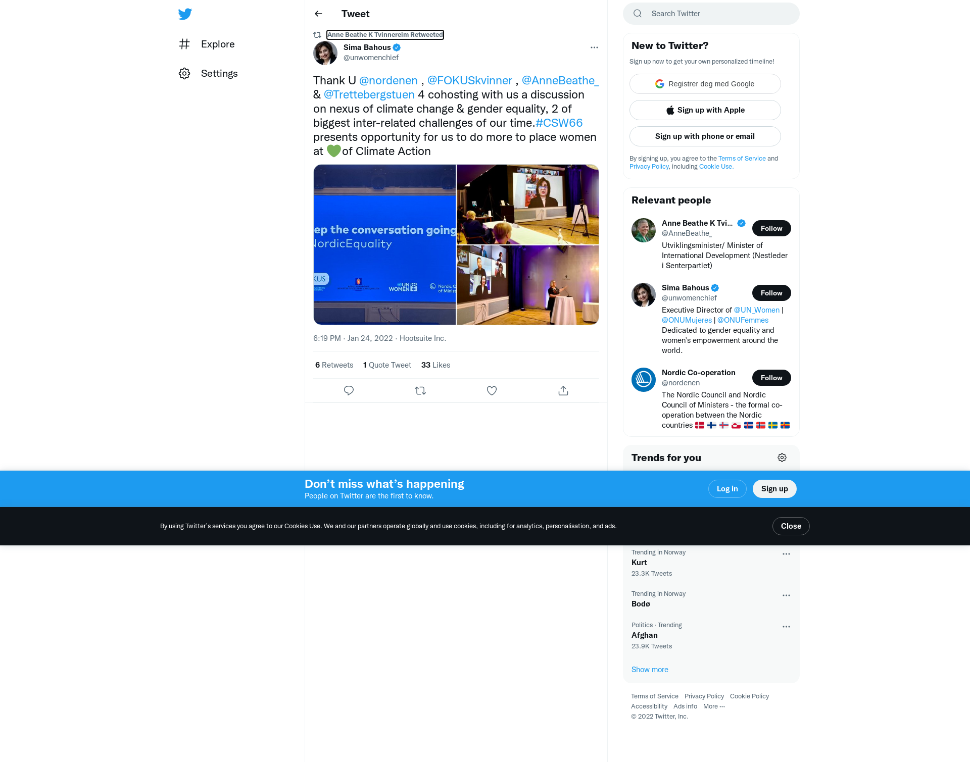RT @unwomenchief: Thank U @nordenen , @FOKUSkvinner , @AnneBeathe_ & @Trettebergstuen 4 cohosting with us a discussion on nexus of climate change & gender equality, 2 of biggest inter-related challenges of our time.#CSW66 presents opportunity for us to do more to place women at 💚of Climate Action https://t.co/o7UyW4xhXx